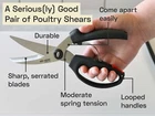 Blades separate for thorough and easy cleaning Spring loaded soft grip handle prevents hand strain Handle loop and bolster prevent hand from slipping forward Curved, tapered blades allow access to hard to reach places Blade notch securely holds bones when cutting. Micro-serrated blade grips skin and prevents slipping