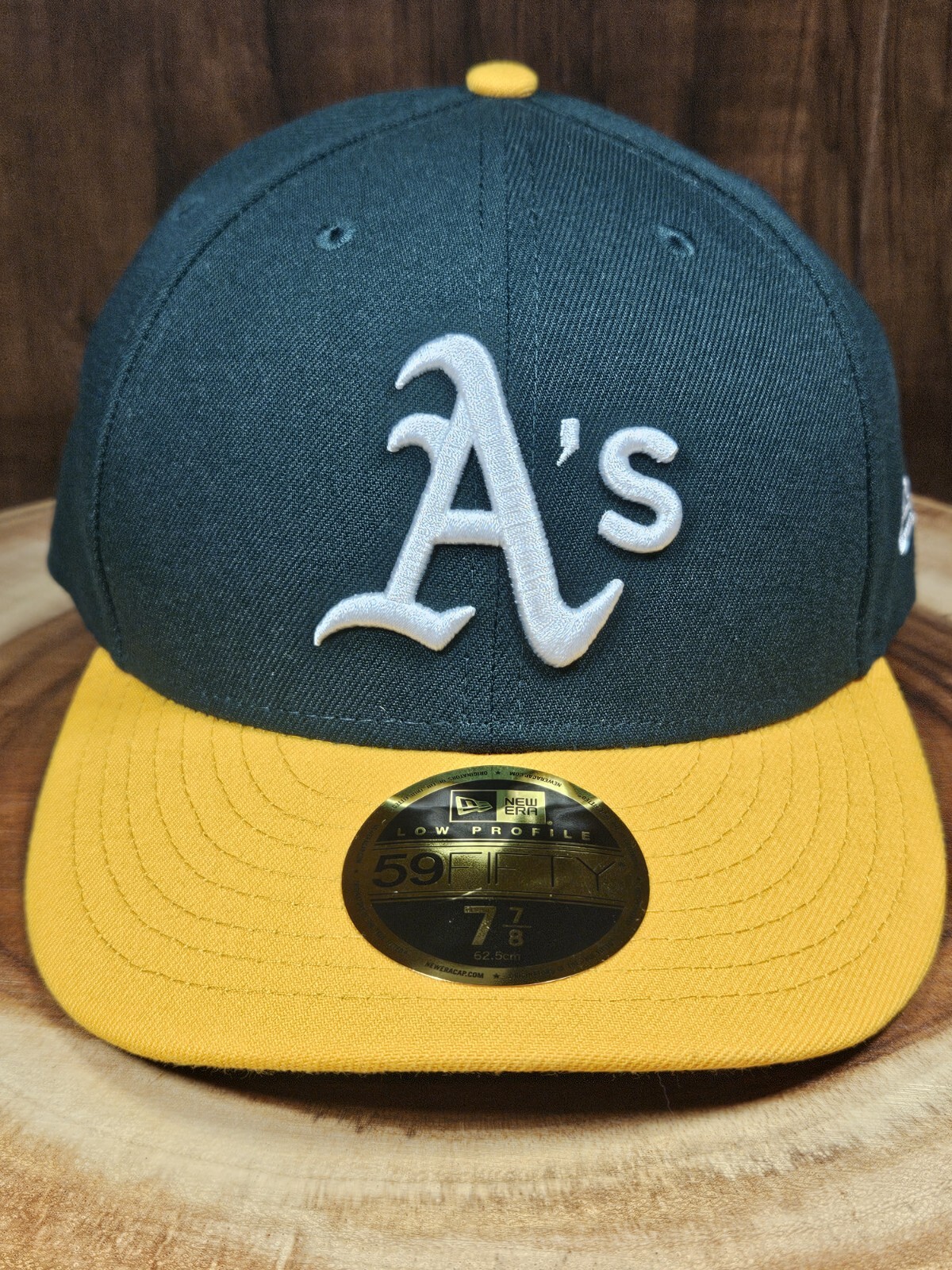 Crafted for baseball aficionados and style enthusiasts alike, the Oakland A's New Era 59Fifty Low Profile Fitted Hat Cap is a quintessential accessory for any wardrobe. Boasting a crisp green and yellow color scheme, this cap is a testament to the timeless appeal of MLB baseball and streetwear culture. The solid pattern and classic design ensure this hat will complement a variety of outfits, making it suitable for business, casual wear, or cheering on your team at the game. The hat is available in size 7 7/8, ensuring a comfortable fit for those who know their exact head size. Its fitted feature guarantees a secure and snug feel, without compromising on style. Whether you're traveling, attending a cocktail party, or simply out and about, this New Era cap is a versatile addition to your collection.