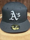 Crafted for the dedicated sports enthusiast, the Oakland A's New Era 59Fifty Trucker Fitted Hat is a versatile addition to any fan's wardrobe. This sleek black cap, sized at 7 1/2, features a solid pattern that exudes a classic, streetwear vibe, perfect for complementing a wide range of outfits, from casual to business casual. The hat's breathable mesh back and fitted design ensure a comfortable fit, making it suitable for various occasions, from a day at the ballpark to a casual outing. The New Era brand guarantees quality and style, while the cap's association with MLB Baseball adds an authentic touch for those who follow the sport.