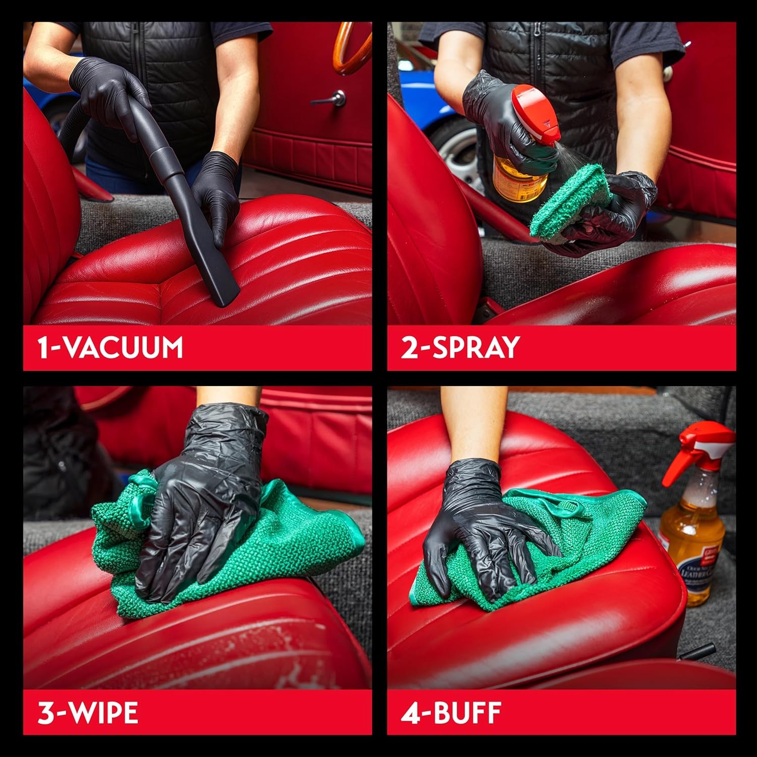 Odor Neutralizing Leather Cleaner for Car Seats, Dashboard, Door Panels, Eliminates Unwanted Smells, 10971, 22oz DEEP CLEAN AND ODOR REMOVAL: This powerful car leather cleaner penetrates deep into the grain to lift dirt, stains, and unwanted smells, restoring your leather or vinyl to a fresh, clean, and like-new condition. SAFE AND EFFECTIVE: The pH-balanced formula of this auto leather cleaner is tough on stains but gentle enough for use on aniline and pigmented leather; Made in the USA. ELIMINATES TOUGH ODORS: Unlike other cleaners that just mask smells, our leather odor remover neutralizes unpleasant odors at the source for long-lasting freshness. VERSATILE FOR ALL SURFACES: Ideal for leather and vinyl seats, dashes, door panels, and more, this genuine leather cleaner lifts dirt and grime while restoring the natural look of your car interior with a clean and refreshed finish. EASY-TO-USE LEATHER INTERIOR CAR CLEANER: Simply spray and wipe to quickly lift dirt, grime, and stains from leather and vinyl surfaces.