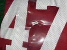 Show your Buckeyes pride with this preowned Russell Athletic jersey featuring AJ Hawk's #47. Perfect for any Ohio State fan, this unisex adult jersey is made of high-quality materials and designed for comfort. Whether you're heading to the game or just want to show off your team spirit, this red jersey is sure to turn heads. The jersey is sized as a medium and features the iconic Buckeyes logo on the front. It's ideal for football season or any occasion where you want to show your support for the Ohio State Buckeyes. Don't miss out on this must-have fan apparel piece! Note: it’s modified on the sides