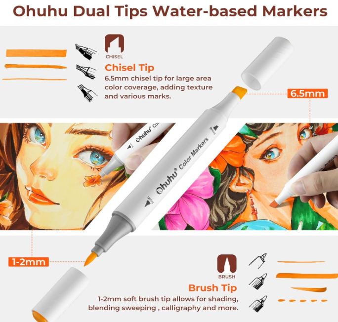 Ohuhu Markers Brush Chisel Tip: Water-Based 60 Colors Double Tipped Art Markers for Adults Coloring Books Kids Calligraphy Drawing Sketching Bullet Journal with 1 Colorless Blender and Case Brand Ohuhu Ink Color 60 colors water-based ink Number of Items 60 Point Type Brush & Chisel Recommended Uses For Product Coloring,Drawing About this item NON-TOXIC & ODORLESS WATER-BASED INK: Marker ink isn’t any good if it’s toxic and nasty. That’s why Ohuhu markers employ water-based ink that’s non-toxic, acid-free, and odorless for the ultimate painting experience. Plus, the water-based ink is way easier to wash and clean than the alcohol one, freeing you from annoying cleaning hassles! BRUSH & CHISEL TIPS: With dual tips at your disposal, get ready to take your creativity to the next level with Ohuhu markers for adult coloring books! The soft brush tip (1-2mm) is perfect for shading, blending, and creating intricate details like arcs, waves, and calligraphy. When it comes to covering larger areas quickly, the chisel tip (6.5mm) has got you covered. It is great for coloring, journaling, drawing, calligraphy, and note-taking. 59 VIBRANT COLORS + 1 COLORLESS BLENDER: Unleash your creativity with Ohuhu coloring markers! Each set includes 59 vibrant colors, along with a colorless blender for anime-inspired artwork and skin tones. Whether it's anime painting or any other type of art, Ohuhu color markers are here to let your imagination run wild and bring your creations to life! COLOR-CODED CAPS & COLOR SWATCH: Stop endlessly searching for the right color! Ohuhu markers come with color-coded caps that match the corresponding color numbers. It's a quick and easy way to spot your desired color in a flash. And if you want to take it a step further, you can even DIY your own color swatch for easy reference. Say goodbye to the hassle and hello to convenience with Ohuhu markers brush tip! IDEAL GIFT CHOICE: Looking for the perfect gift for someone who loves art or DIY crafts? Look no further than the Ohuhu art pens! Whether it's for a birthday, Christmas, anniversary, or just to show your appreciation, these markers make a thoughtful and versatile gift. On the go? Just pack all the markers into the included plastic case and hit the road. ADVICE ON COLOR MIXING AND PAPER SELECTION: You can use the colorless pen to dip in another color to produce the gradient effect. Moreover, choose two similar colors with less difference to mix for a better mixing effect. When mixing, please draw on heavy-weight watercolor paper to avoid scratching, peeling of the paper, ripped paper, warped paper. . We offer FREE shipping on all orders! . We ship within Five business days of payment, usually sooner. . We use a selection of shipping services such as UPS, FedEx, USPS etc. . We only ship to the lower 48 states, no APO/FPO addresses or PO Boxes allowed. . Local pickups and combined shipping options are not provided at this time. . Your satisfaction is a wonderful reward for our efforts. Please assist us by leaving a positive review if you feel pleased with our service. . In the event that you encounter any difficulties related to your order, please do not hesitate to reach out to us directly through the Messaging system on the Ebay platform. Kindly consider opening a COMPLAINT or a RETURN REQUEST as a last resort, only after all other possible measures have been attempted and we have been unable to provide you with assistance. . We will get in touch with you within 24 hours and make every effort to ensure your satisfaction. . Please rest assured of our service quality.