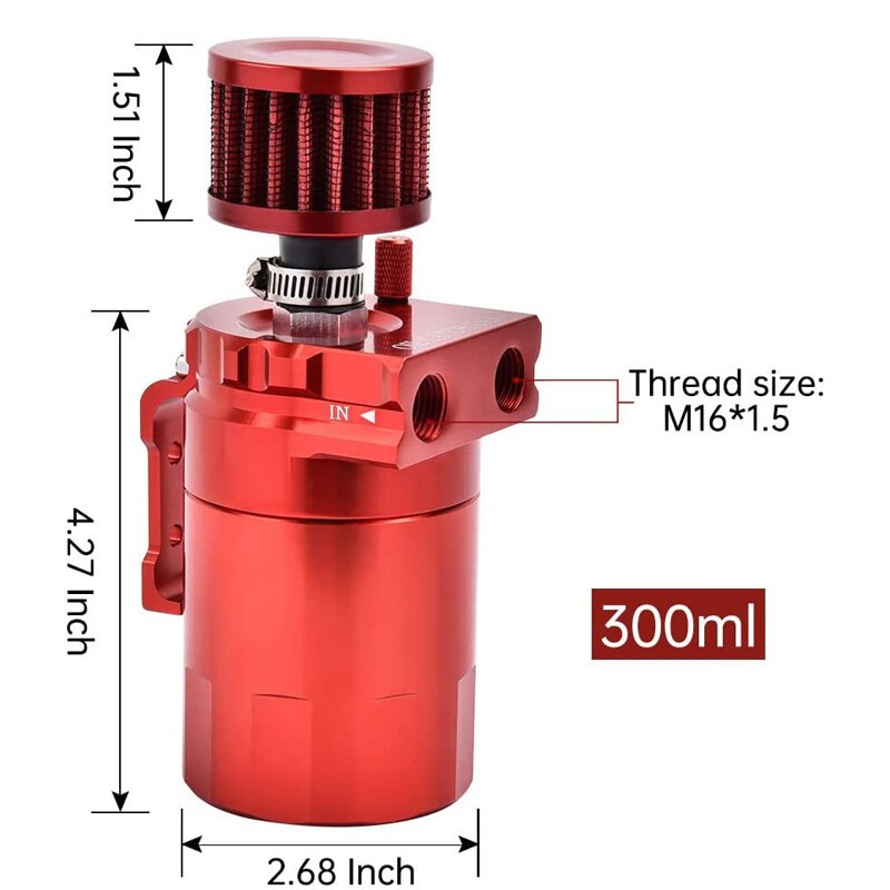Oil Catch Kit for Reservoir Baffled Tank W/ Breather Filter Universal Aluminum 🛢️ Universal Oil Catch Can Kit – 400ML Polish Baffled Reservoir 🛢️ ✨ Key Features Universal Fit : Compatible with most cars and small motorcycles, making it a versatile addition to various vehicles. 400ML Capacity : The polished baffled reservoir holds 400ml of fluid, sufficient for daily use and reducing the need for frequent emptying. High-Quality Construction : Made from lightweight aluminum with an anodized finish—strong, durable, and visually appealing. Note: Aluminum is prone to scratches, but this does not affect functionality. Engine Protection : Collects oil vapor and moisture from the crankcase, preventing them from entering the intake system. Reduces secondary combustion, carbon buildup, and keeps the engine cleaner, extending its lifespan. Upgraded Design : Baffle system cools hot oil vapor, converting it to liquid for efficient collection. Hose clamps prevent disconnections; 3 adapter sizes (with O-ring gaskets) ensure a leak-free fit for different hose diameters. Built-in dipstick allows easy fluid level checks without opening the can. Includes a breather filter for vented installation options. Flexible Installation : Choose between two setups—use with the breather filter as a vented system or without as a sealed can, depending on your vehicle’s needs. 📋 Specifications Material : Lightweight aluminum. Volume : 400ml. Color : Red (anodized finish). Included Hardware : 3/8" fuel line, breather filter, hose clamps, adapters with O-rings, and mounting components. 🔧 Installation Overview Remove the engine cover (if applicable). Disconnect the existing crankcase ventilation hose and set it aside. Prepare the oil catch can: wrap anti-skid tape on screw threads, attach screws to the can. Mount the can using brackets (use your own nuts/bolts) in a suitable location. Cut a new hose to length, attach it to the can and engine ports, securing with clamps. Detailed steps may vary by vehicle—basic tools required. 📦 Package Includes 1 × Complete Oil Catch Can Tank Kit (includes reservoir, breather filter, hoses, clamps, adapters, and mounting hardware). 💡 Benefits Reduces Carbon Deposits : Prevents oil vapor from recirculating into the engine, keeping intake valves and pistons clean. Improves Efficiency : Maintains optimal air-fuel mixture by reducing oil contamination in the intake system. Easy Maintenance : Dipstick allows quick checks; simple to empty and clean when needed. 📝 Important Notes Scratch Notice : Aluminum construction may show scratches, but this does not impact performance. Contact the seller with concerns. Support : Reach out first with any issues for prompt resolution. Avoid neutral/negative feedback before seeking assistance—solutions will be provided. Protect your engine and enhance performance with this reliable oil catch can kit—order today! 🔧
