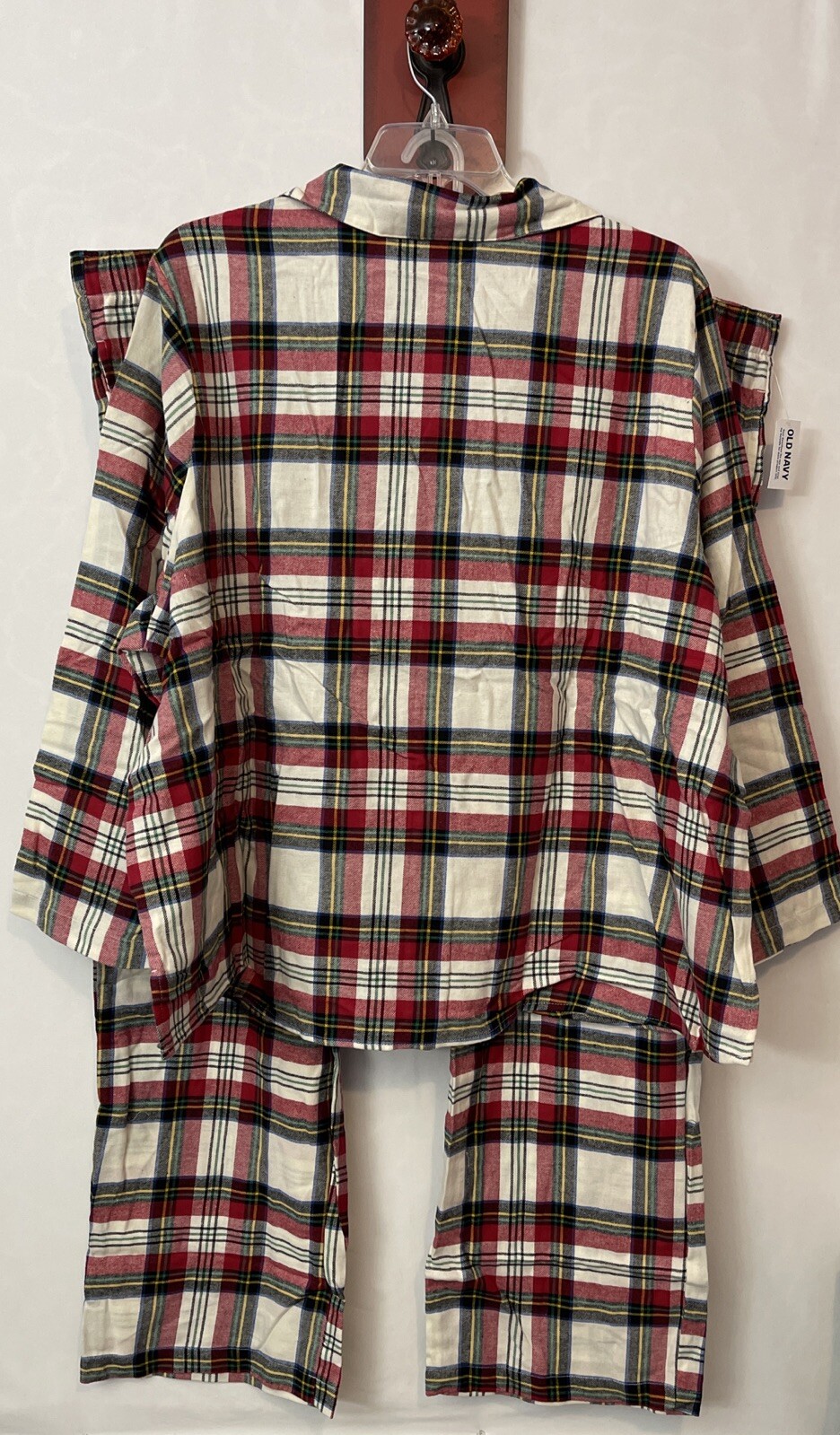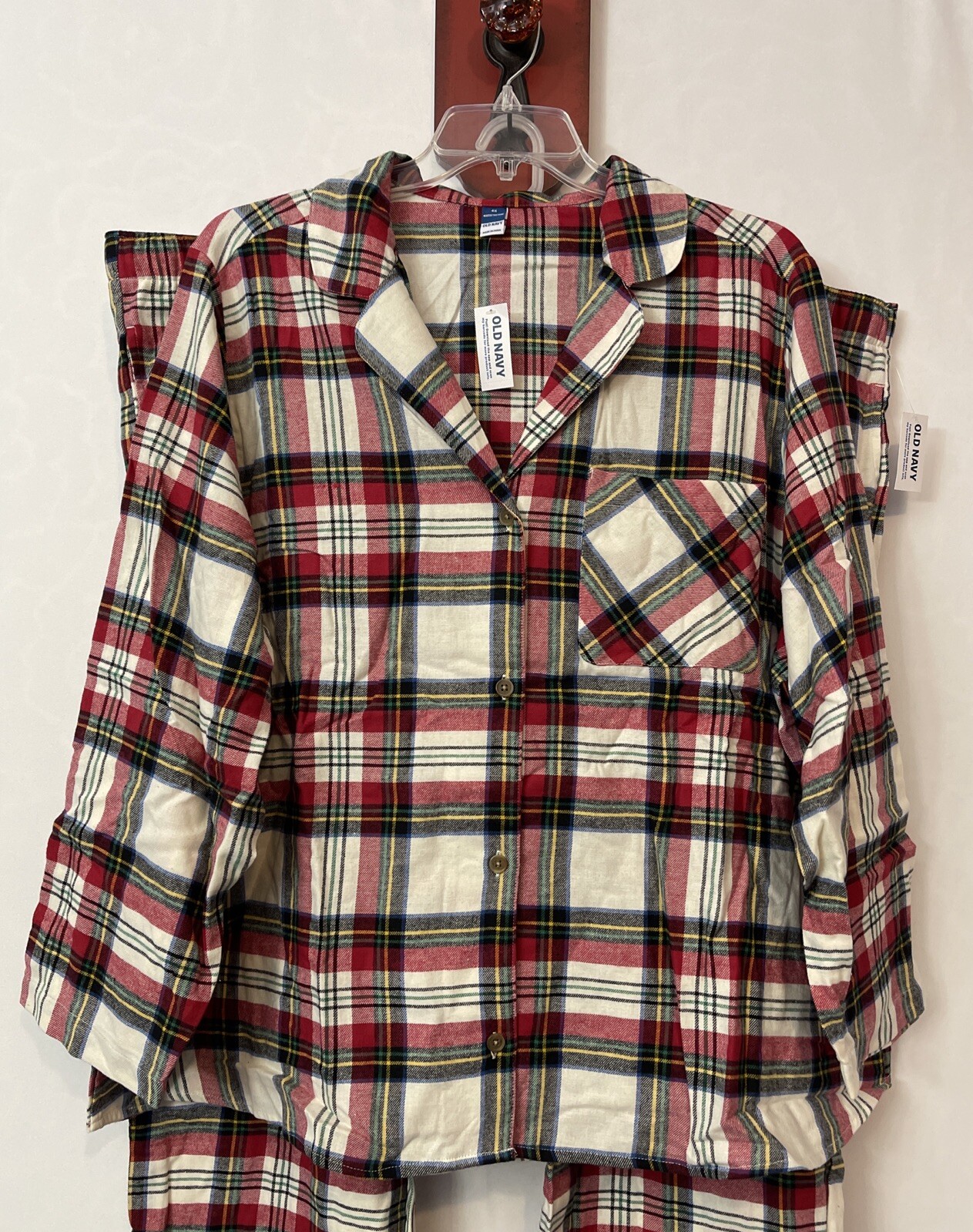 Get ready for the holiday season with this festive Old Navy women's lounge set! The set includes a comfortable pair of plaid pajama pants and a matching collared shirt. The button-accented flannel fabric is made of soft and cozy cotton, perfect for keeping you warm during the chilly fall and winter months. The set features a size 4X and is part of the plus size women's clothing collection. The colorful plaid pattern adds a touch of Christmas spirit to your loungewear collection. This lounge set is perfect for relaxing at home or as a gift for a loved one. The shirt is button down with a chest pocket. The pants are pull on style with a drawstring. There are pockets on each side of the pants. Shirt: Length - 30 inches Chest - 30 inches across laying flat Pants: Inseam - 31 inches Waist - 26 inches across laying flat