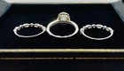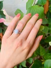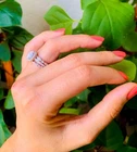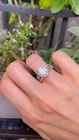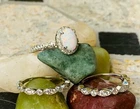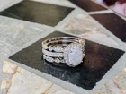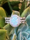 Message me for size request. Full sizes 4-11 The 3 piece White Fire Opal Ring Set. This elegant white fire opal is set in a diamond halo of sparkling CZ's and surrounded by two sparkling CZ bands made of AAA quality. This set features 3 pieces. Our Whie fire opal ring and 2 fitted CZ bands. The opal ring is made with incredible detail, showcasing a dazzling array of iridescent colors depending on what lighting you are in. Truly a breathtaking piece, perfect for the woman you love as an engagement or wedding set or just a great everyday occasion ring for yourself. Incredibly sparkly and eye catching, this ring is sure to be a conversation starter and it makes for an elegant look on any hand. This gorgeous ring set is made of sterling silver and lab created opal All of our stones are individually set to provide you with a meticulously crafted piece of beautiful jewelry. These sterling silver rings come with a high shine rhodium finish to help prevent tarnish. *The price is for one set of three rings* Your jewelry purchase will come in an elegant velvet gift box, ready for gift giving to that special person or just yourself!