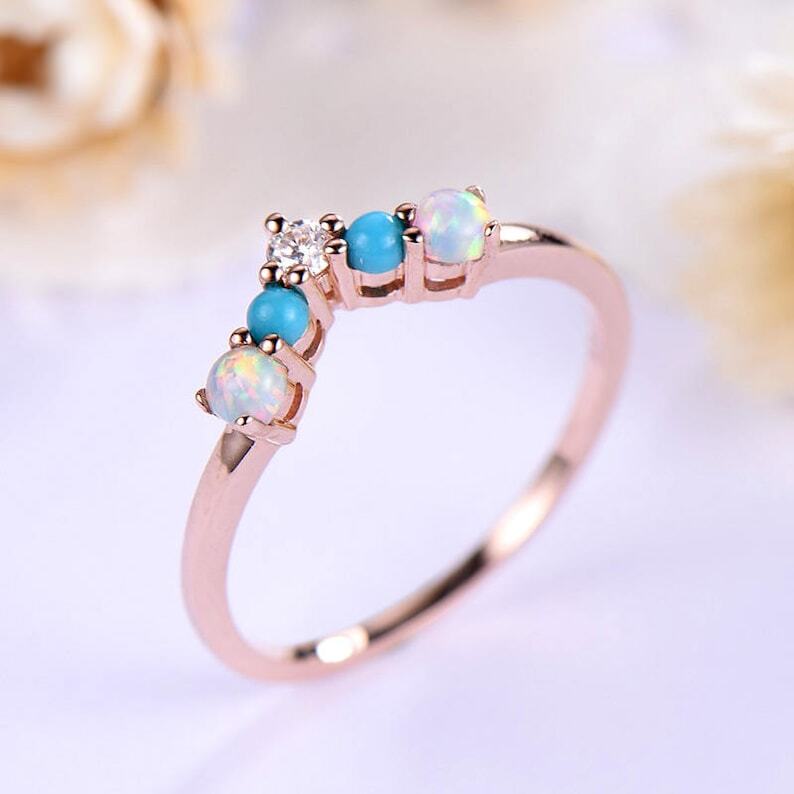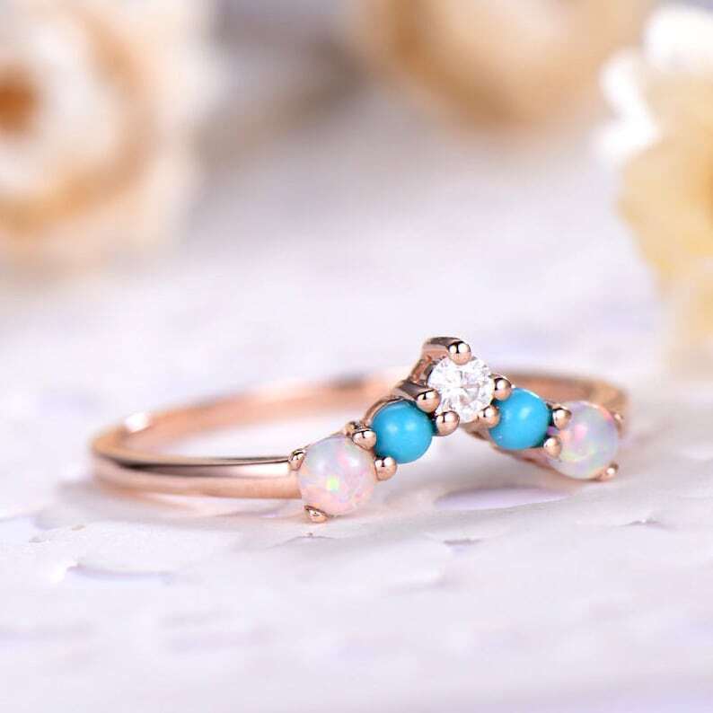 Opal Turquoise Chevron Wedding Band in 14k Rose Gold Bridal Ring Gift