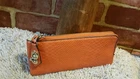 BEAUTIFUL WALLET ZIPS SHUT AND LOCKS WITH A TOGGLE INTERIOR HAS A CENTER ZIPPER COMPARTMENT 4 CARD SLOTS 1 ID SLOT AND PLENTY OF ROOM FOR $$$$BILLS ORANGE TEXTURED NEW NEVER USED!