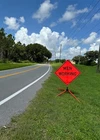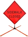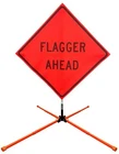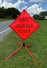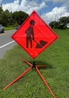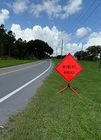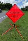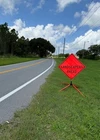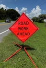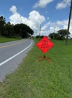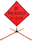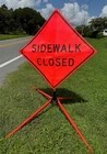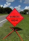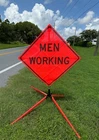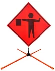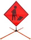 The OrangeGear® mesh signs are made from 15 oz. tightly woven, non-reflective, fluorescent orange mesh. Each sign comes printed with a MUTCD TTC complaint standard legend, as well as a pair of fiberglass ribs and sewn on corner pockets. The OrangeGear® sign stand is lightweight and compact for easy handling and storage. It occupies only 1 cubic foot of storage space when folded. Each leg is individually released with a kick release lever for added stability on curbs or uneven terrain. The riveted orange PVC caps at the end each leg increases visibility of the sign stand. The sign stand accommodates 36" and 48" roll-up safety signs. The legs extend up to 41". Both the sign and stand are designed to meet MASH specifications. Mesh Sign Features: Made with durable 15 oz fluorescent safety orange woven mesh Comes with standard orange fiberglass roll-up sign cross ribs Sturdy sewn-on mesh corner pockets to fit cross ribs MUTCD TTC compliant Easy to setup and take down Maximum portability Effective temporary traffic control or construction operations Sign Stand Features: Constructed of steel Compact for easy storage Occupies only 1 cubic foot of storage space when folded Kick release lever to lower each individual leg Orange powder coated legs for added visibility (steel stand only) Riveted PVC caps on each leg for added stability Spin-handle accommodates 36" and 48" roll-up safety signs Legs extend up to 41" Specifications: Stand weight - 18 lbs. Stand extended dimensions: 41" W x 26.75" H Stand folded dimensions: 5" W x 24" H Sign dimensions: 36" x 36" x 50" Steel Sign Stand: Steel Sign Stand Additional Features: Where to Use Mesh Signs: Mesh Sign Additional Features: