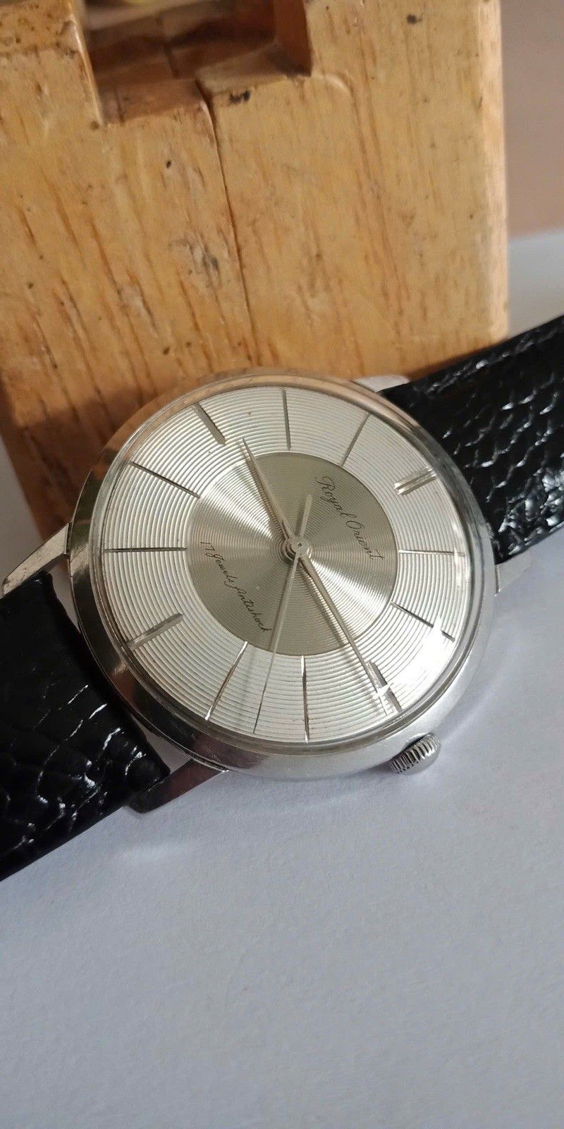 Orient Royal 17jewels Antishock, hand-winding for Men. Movement: Hand-winding Case size: 35.5-36mm (not include crown) It runs well and not OH service yet Leather strap and accessory buckle. PLEASE SEE ALL PHOTOS BEFORE BUYING. Any questions pls DM me, thanks!