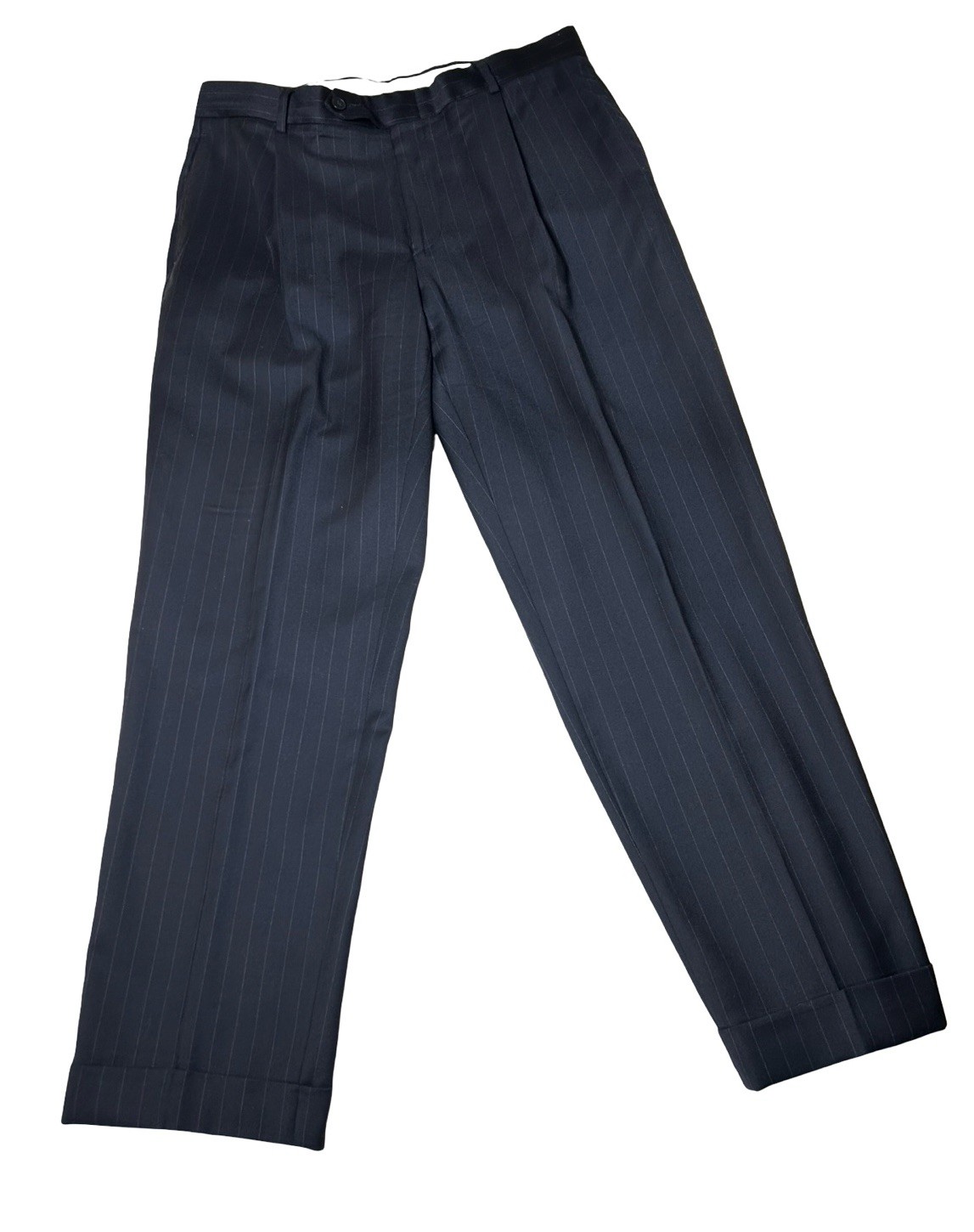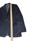 Oscar De La Renta Profile 2pc Wool Suit Size 42S Navy Blue 34” Waist Pinstriped Good vintage condition . Normal signs of wear and use, there are some discolorations inside the pants behind the zip. Please study pictures carefully before purchasing Please review the pictures Very carefully, before purchasing, for condition, details, and measurements. We do our best to describe accurately all of our items. The Approx. Measurements Laying Flat (not doubled) : Blazer Measurements : 30" Top to bottom length 19" Shoulder to Shoulder 23" Armpit to Armpit 23.75” Sleeve length 23.75" Width at hem Pants Measurements: 40" length top to bottom 17” Waist 11” Rise 30” inseam 14” Leg width 8” Leg opening Feel free to ask any questions. Thank you for visiting our store! Bnjckts7