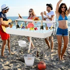 TWO LAYERS Ice Cooler Folding Table for Party 🧊DOUBLE TIER 2 IN 1: Elevated model upgraded double-tier design ice table with top stand for party foods that don't need refrigeration for storage, and table slots as ice storage for food coolers. Novel and unique shape coexists with practicality, cost-effective choice! 🧊FOLDING PORTABLE: This 4 Ft ice cooler table folds with stainless steel rigid legs that lock into place and won't pop open during transportation, and a carry handle for easy landing. 🧊EASY CLEANING AND DRAINING: Our party tables with drain prevents water from pooling, and the HDPE surface resists dirt and stains and cleans up in one wipe, reducing labor costs. 🧊REMOVABLE SKIRT AND METAL HOLDER: The drink cooler table comes with a skirt and velcro fasteners, and the faux satin sheen adds an elegant and classy vibe to your party. The metal shelf adds extra storage space and can be hidden under the skirt. 🧊READY-TO-USE SPACIOUS TABLETOP: This outdoor food keeper uses a 3.5" deep, 22"×40" large tabletop to allow users to store large amounts of ice to keep beverages, fruits, and cold foods chilled for an extended period of time. 🧊MADE FOR LONG USE: Our ice cooler folding table is made of stainless steel legs and HDPE surface, which is resistant to corrosion, rust, cold and pressure. The triangular support structure of the legs makes the whole not easy to deform and break. Suitable for weddings, parties, picnics, camping trips, BBQ, fishing, etc., indoor and outdoor universal.