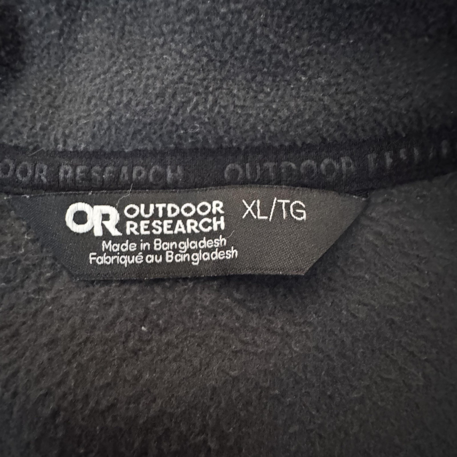 Outdoor Research Pullover Mens XL Black Polartec 100 Fleece 1/4 Zip Hiking Pre-owned pullover with light general wear from prior use. Fleece fabric, seams, and zipper are clean and intact with no holes or stains, and cuffs and hem lay flat. Small fraying at the bottom edge of the Polartec side tag; interior size and care tags present, no original retail tags or packaging included. Brand: Outdoor Research. Style: Mens Polartec 100 quarter-zip fleece pullover. Color: Solid black. Tag size: Mens XL (XL/TG). Material: 100% polyester lightweight fleece. Design details: Mock neck with 1/4 zip front closure, long sleeves, straight hem, and soft brushed fleece interior and exterior for warmth and comfort. Features: Lightweight insulating layer suitable for hiking and outdoor activities, breathable fleece construction, and easy-wearing pullover design that works well as a mid layer or casual top. Branding and identifiers: Tonal OR logo embroidered on the left chest, Polartec woven tab at the lower side seam, interior neck tape repeating "OUTDOOR RESEARCH" branding, and main neck tag reading "OR Outdoor Research XL/TG Made in Bangladesh." Care and style codes: Interior care label lists 100% polyester fabric, washing instructions, website and RN# 97085 / CA# 32350; additional interior tag shows "AP10017" and "M OR Polartec 100 Quarter Zip" with code 322025 and V064. Occasion: Versatile fleece pullover ideal for hiking, camping, travel, and everyday casual wear in cool weather. 112675
