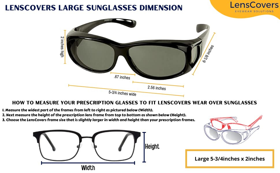 CHECK SIZING BEFORE PURCHASE | have 5 different sizes, they are not one size fit all so make sure to take a look at the sizing guide and make sure you choose the right size for your sunglasses Durable | With a plastic frame and lens, these fit-over lenses ensure safe and reliable eyewear for the customer. is committed to the highest quality sunglasses covers, no matter who it is for. Full Coverage | Sunglasses that cover your prescription glasses with side shield panels - that provide full sun cover - as well as a more complete fit for your original specs. It's like shields for your eyes. Unisex | wraparound sunglasses are for both men and women, just take a look through the variants to find which is best for you. Original | On Amazon since 2013, only polarized glasses covers have been certified to meet ISO 12312-1:2013 quality standards Polarized | These polarized sunglasses produce a crystal clear picture. With UV400, 100% UVA and UVB protection, rest easy that your eyes are safe. also offers a mirror coating on some models, with all models providing polarized properties and a cocoon-like fit.