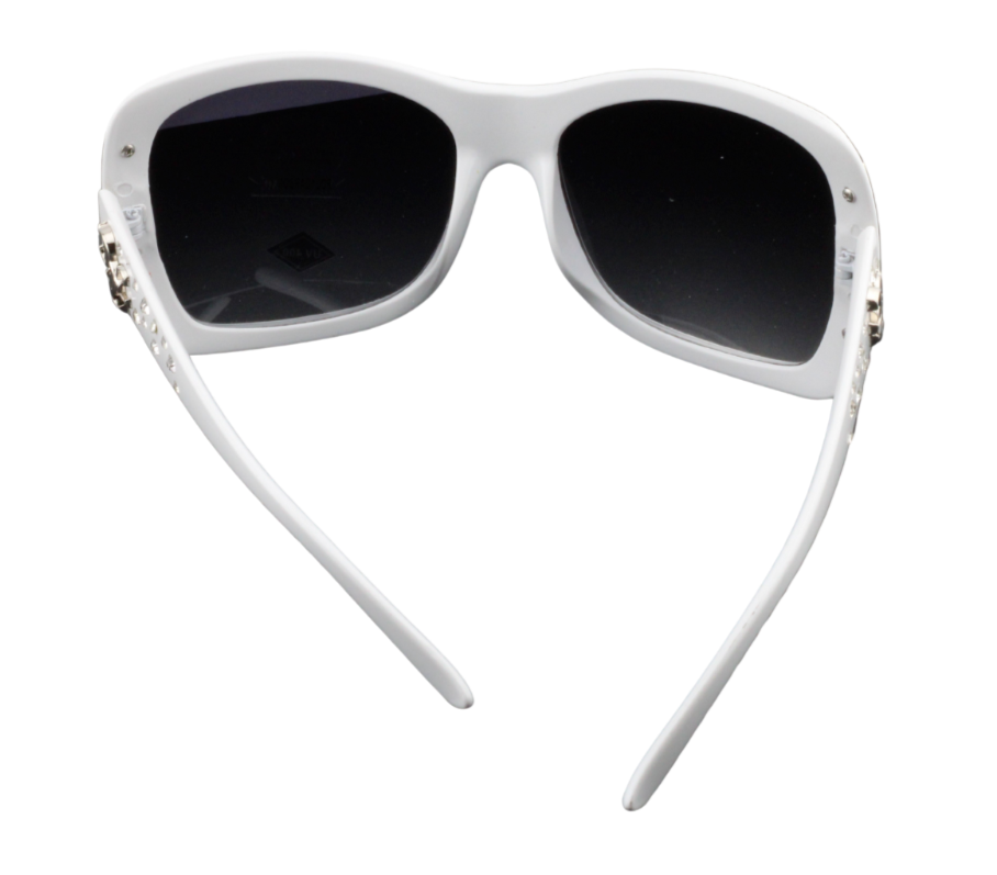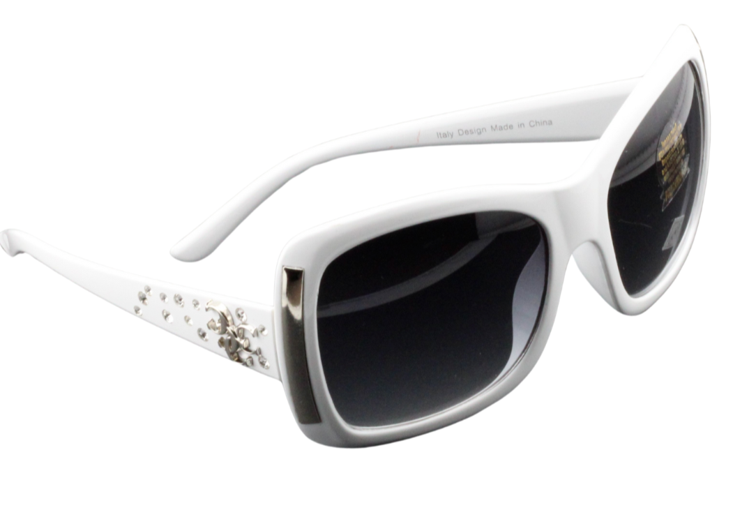 Elevate your style with these glamorous sunglasses that feature oversized lavender gradient lenses and rhinestone accents on a sleek white plastic frame with silver details. There is an overlapping "C" design at the temple. Perfect for any occasion, these shield-style sunglasses evoke a sense of classic 80s and 90s retro fashion with a modern twist. Whether you're hitting the beach, cruising on your motorcycle, or just hanging out with friends, these shades offer UV400 protection and lightweight comfort with a temple length of 120mm. Add some fun to your wardrobe with these personalized sunglasses that cater to a variety of themes such as movie, rock, and outdoor activities. These sunglasses are the perfect accessory for any fashion-forward unisex adult.