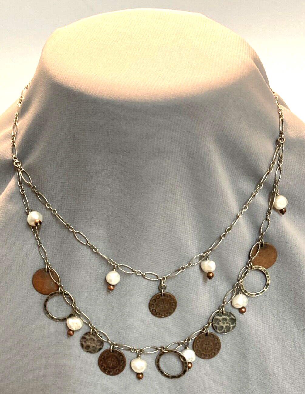This stunning necklace is a must-have for any fashion-forward individual. The piece features two tiers of oxidized copper coins and sterling silver accents, accentuated by beautiful round freshwater white pearls. The lobster closure ensures a secure fit, and the pendant/locket type is a timeless coin design. The necklace is 16" Long with a 2" extender. Whether for any occasion or as a gift, this Silpada brand necklace is sure to impress. Fast shipping includes Insurance. Comes from a smoke free environment. Check out my other listings for more Silpada items.