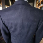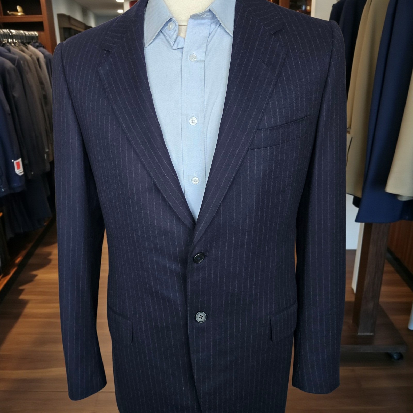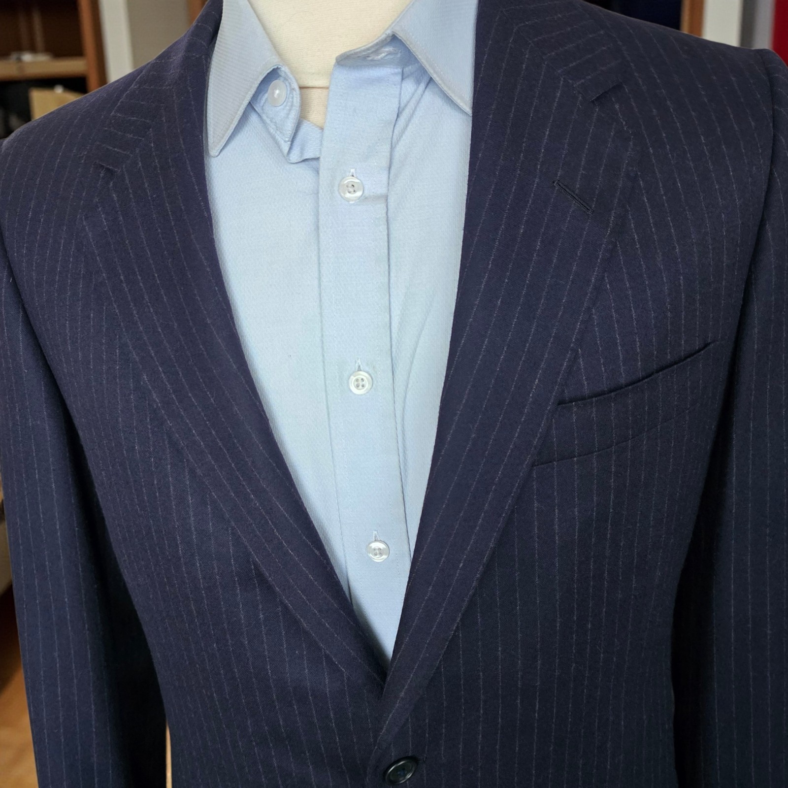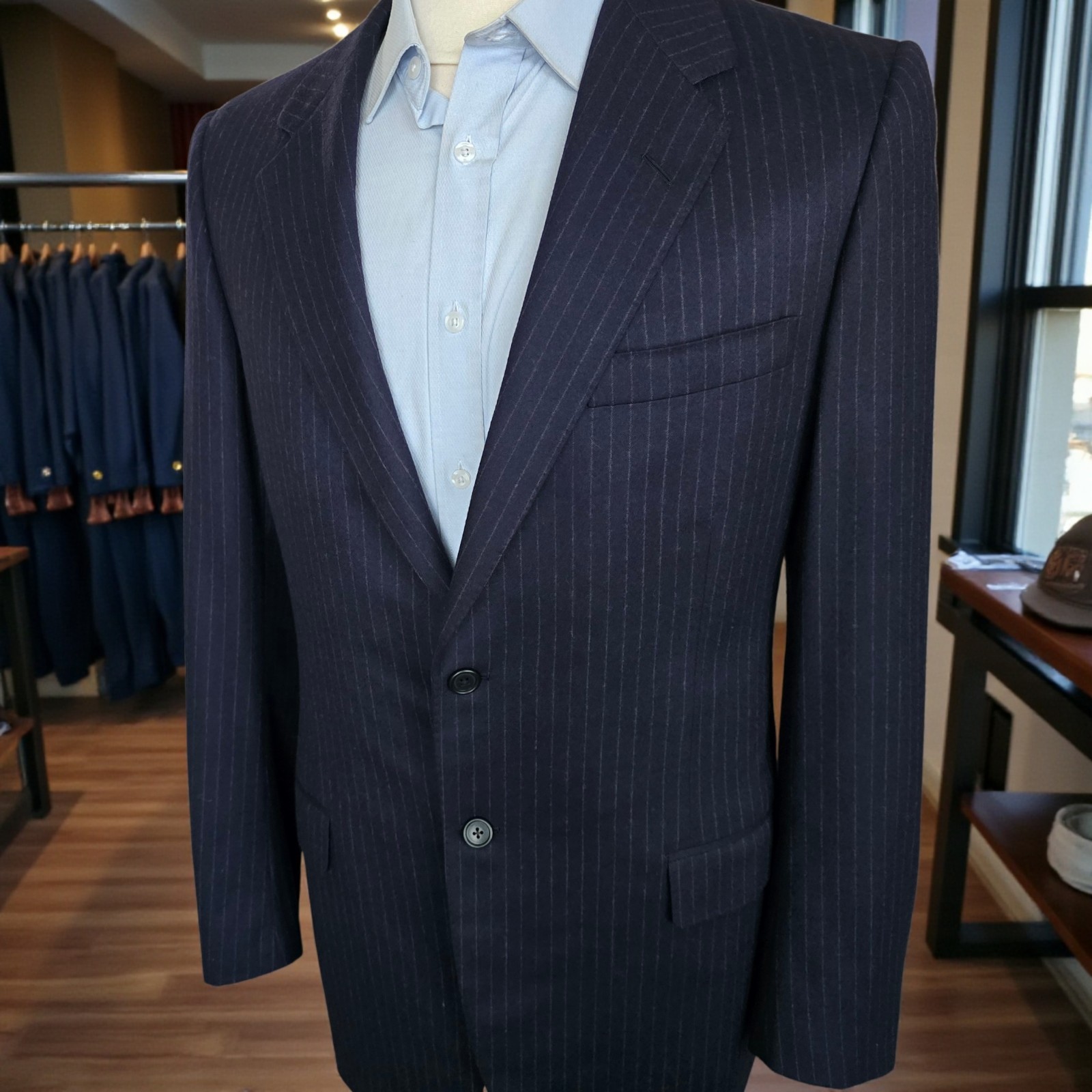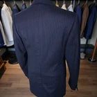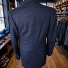 Size: 40L USA with 26-inch arm length and a jacket length of 31.5 inches. Pictured on a size 40 mannequin For complete measurements, see photos #2 To see exactly how we measured, see the last series of photos. 1 inch of extra fabric to extend the arm length Condition: excellent vintage condition. No stains. No snags. No holes, no smells. No flaws. No size or fabric tag Full canvas, working cuff, ventless, light shoulder pads, navy flannel with chalkstripe, 4.25 inch lapels Return policy: We offer free shipping and no returns. We can not afford to offer both in the highest return category on eBay. It becomes very expensive to mail out items for free for people to try on if they are not confident in checking the measurements in picture #2. If you prefer to have the ability to return the item and pay $12.95 shipping, please send us a message, and we can change the listing format to offer returns. The $12.95 shipping cost would break us out even in the case you needed to return the item. We ship the next business day after the payment is made.