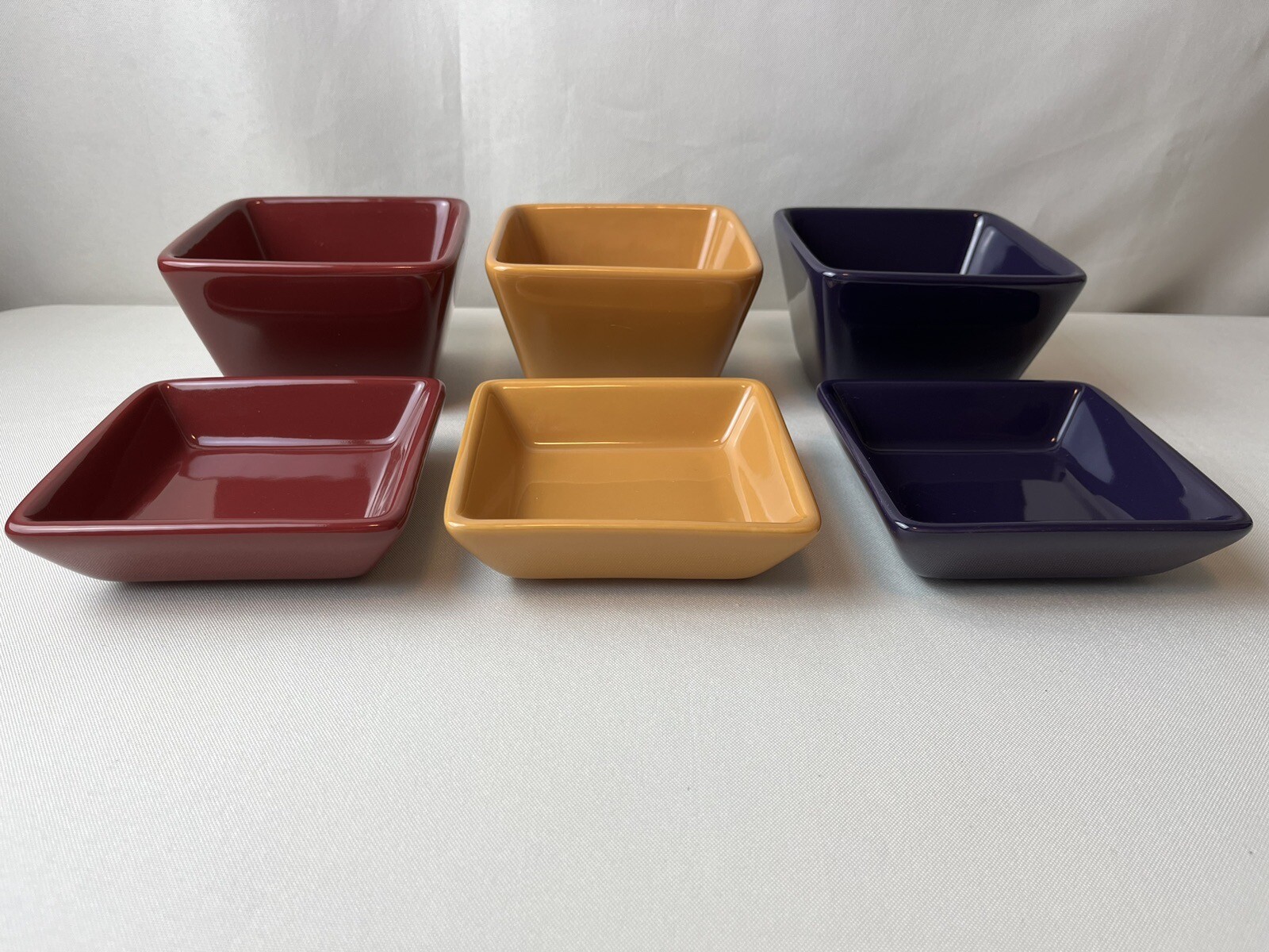PAMPERED CHEF Simple Additions Condiment Dip Bowl & Under Plates Grape, Gold, Cranberry. Bowl 4.5" square x 3" deep. Under plate 1.75" deep