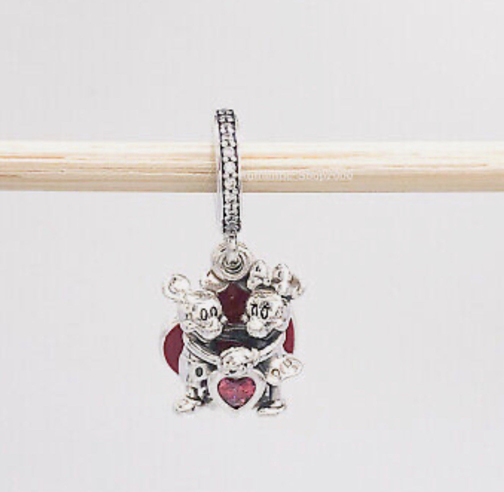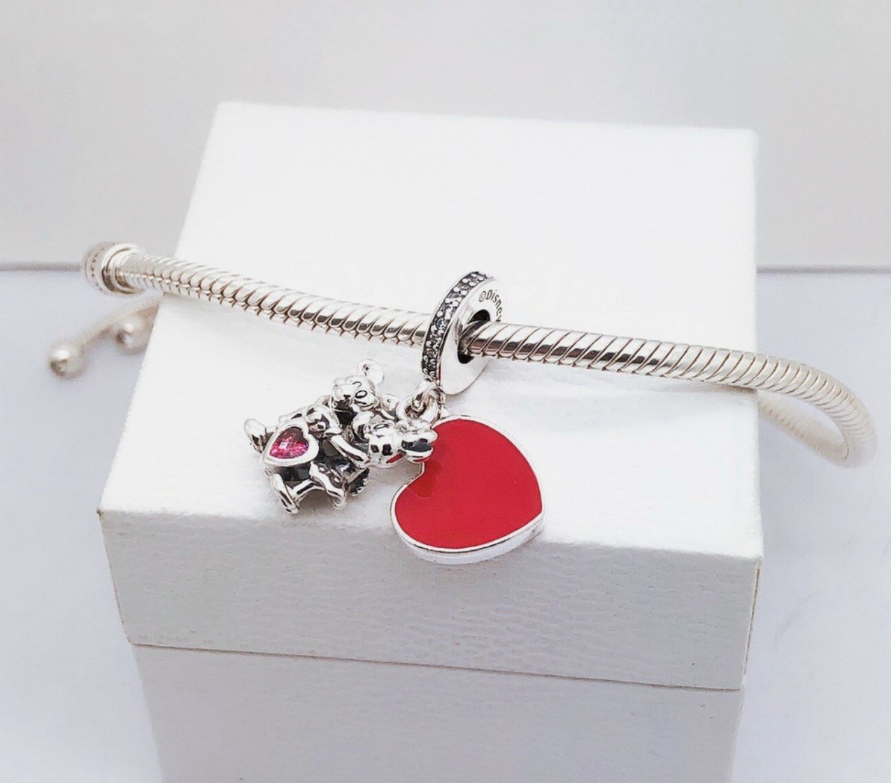 Elevate your jewelry collection with the Authentic PANDORA Disney Minnie & Mickey w/ Love Red Heart Charm. Crafted from high-quality 925 ale sterling silver, this charming piece features a delightful heart shape, half of which is adorned with a red cubic zirconia stone, mimicking the iconic imagery of Mickey and Minnie. The charm's silver finish provides a classic touch that complements any bracelet or necklace. With its dangle design and pavé setting, this charm adds a whimsical yet elegant accent to your personal ensemble. It's a versatile tribute to love and romance, suitable for a myriad of special occasions from birthdays to weddings. Proudly made in Thailand, this PANDORA charm is a testament to both the art of jewelry making and the magic of Disney.