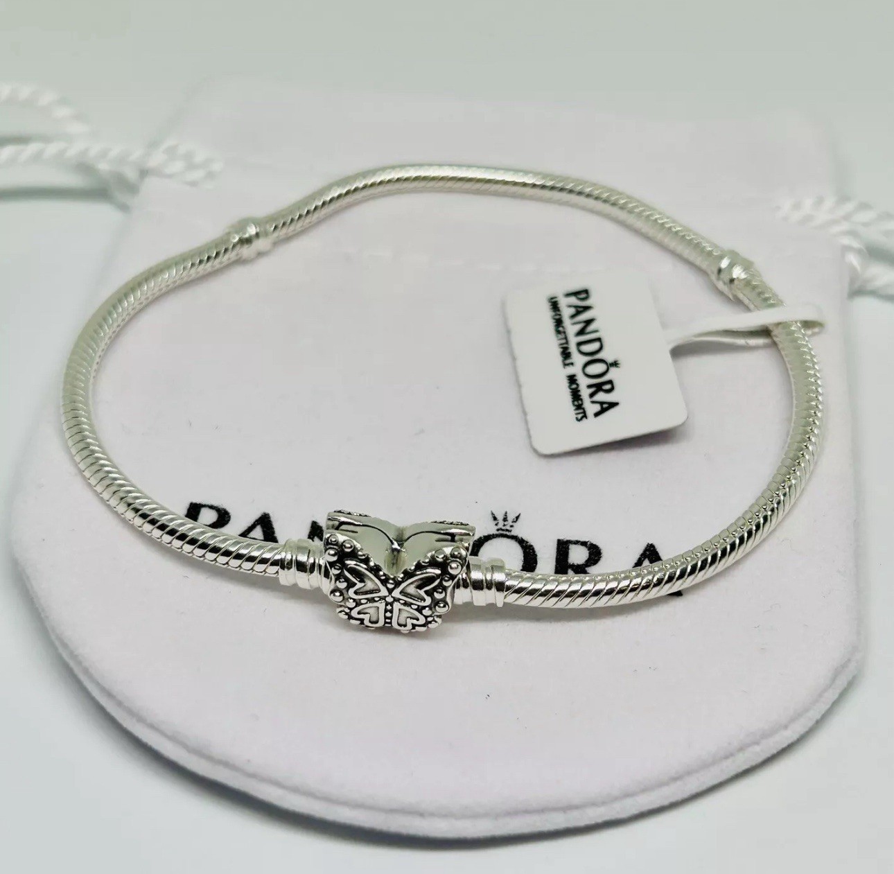 New comes with bracelet and dust bag The PANDORA Moments Butterfly Clasp Snake Chain Bracelet is a stunning sterling silver piece of jewelry featuring a beautiful butterfly charm. This bracelet is perfect for various occasions such as engagements, weddings, birthdays, and holidays like Christmas and Valentine's Day. The snake chain design adds a touch of elegance to the piece, making it a versatile and timeless accessory. Made with lab-created clear cubic zirconia stones and crafted in Thailand, this bracelet is of high quality and a perfect gift for someone special.