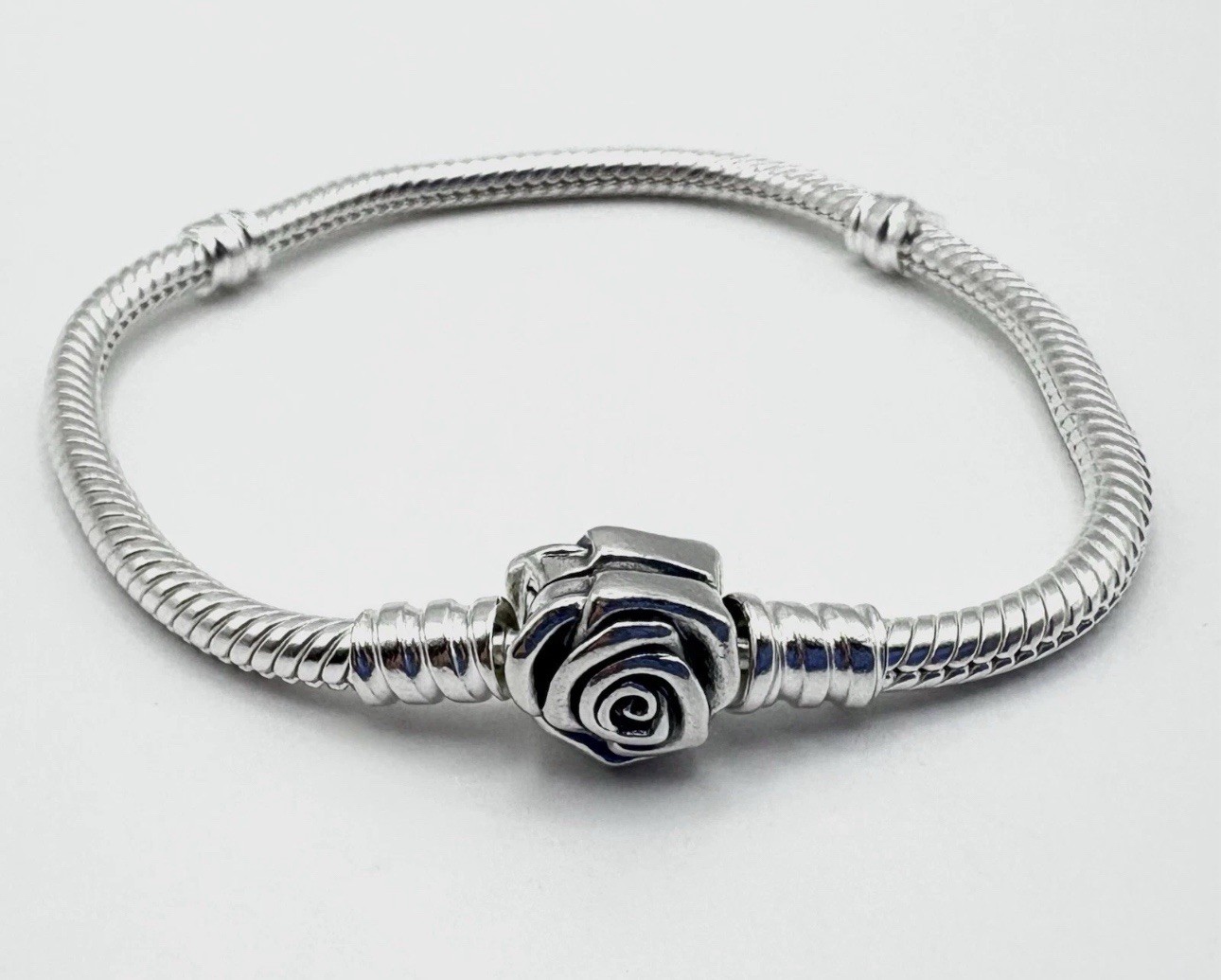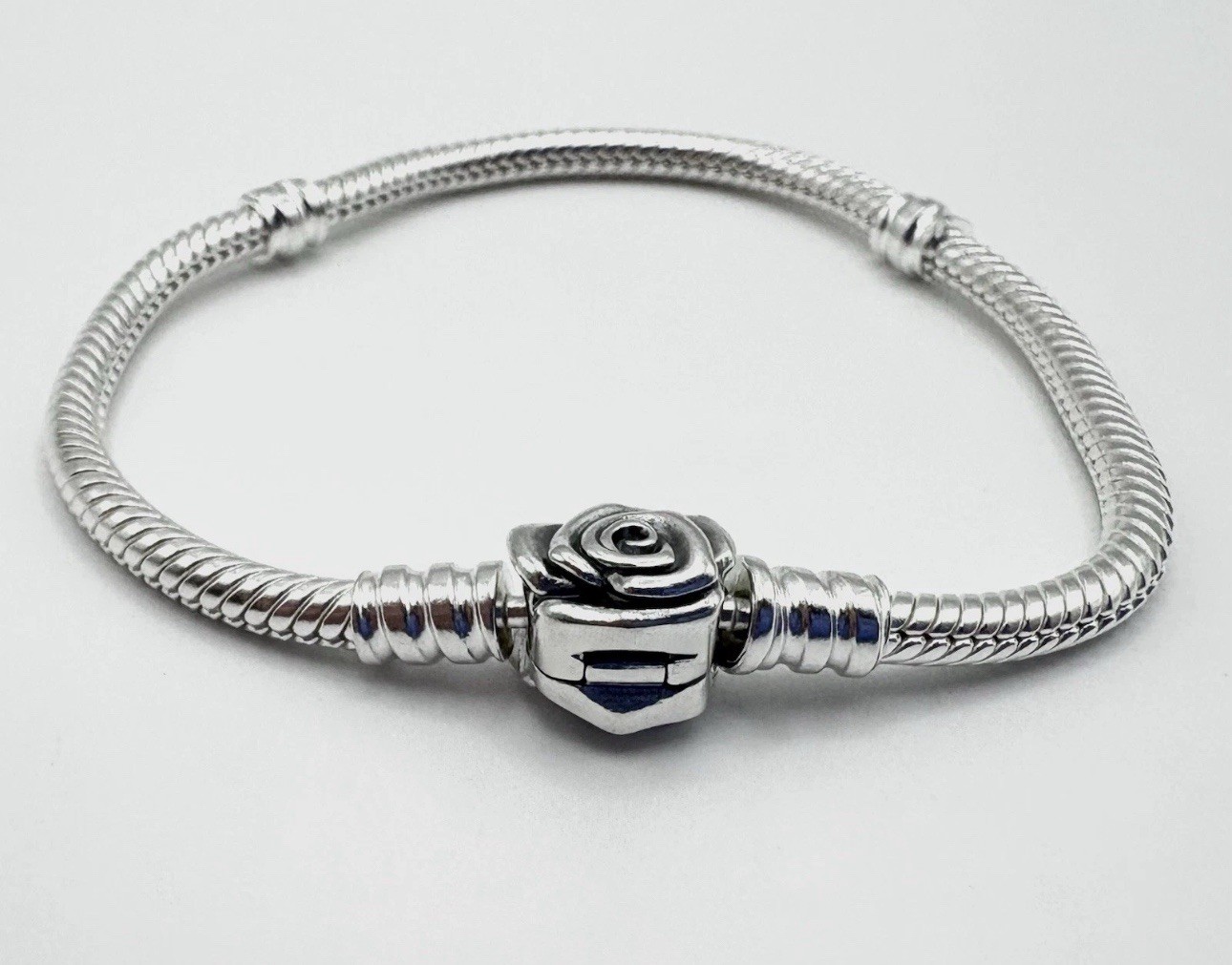 New with dust bag. Please message wrist before purchase. The Authentic PANDORA 925 ale Rose in Bloom Clasp Charm Bracelet is a stunning piece of jewelry made of sterling silver. The bracelet features a rose-shaped charm with a clasp closure, perfect for all occasions. The 7.5-inch chain is a Pandora Moments snake chain, and the bracelet is adorned with any Pandora Moments charm. With its vintage authenticity and brand name, this bracelet from Thailand adds a touch of elegance to any outfit.