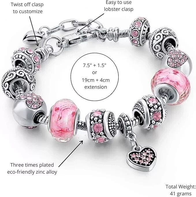 Pink Hearts Silver Plated Charm Bracelet Set, Jewelry Gifts with Beads, Charms, and Adjustable Snake Chain, Fits 7.5"+1.5" About this item: Adjustable Design: Charm bracelet set stacked with crystal charms and beads over a silver snake chain bracelet with an easy to use lobster clasp and link chain extension Customizable: Arrives ready to wear but can be customized to fit your unique jewelry style - open lobster clasp to re-arrange, take away, or add charms and beads Includes Bead Stopper: All genuine Capital Charms bracelets includes a stopper for easy bead adjustments and prevents falling beads if clasp accidentally opens Gift Ideas for Her: Best friend gifts for moms, daughters, sister, friend or girlfriend on occasions like valentines day, birthday, Christmas, and anniversary Gift Ready: All genuine Capital Charms bracelet sets arrive with a branded gift ready box, soft protective jewellery bag and instruction cards