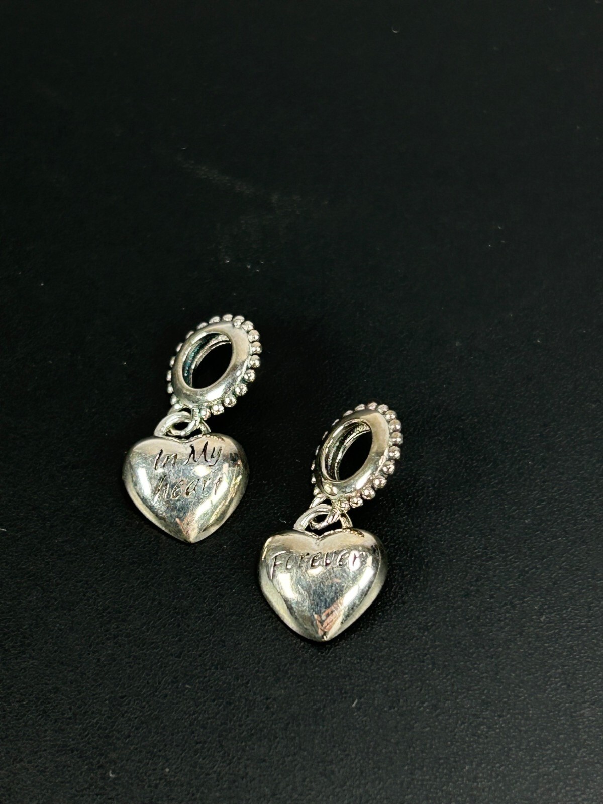 In excellent preowned condition with no major flaws to note. See photos for condition. There is no Pandora marking but they are very similar in style and design. Heartfelt sterling silver charms engraved with "Forever" engraved on one side of the hearts, and "Niece" and "Aunt," on the other sides with an applied heart finial and a hollow heart on the niece charm. • Sterling silver MARKED S925 • Engraved "In My Heart/Niece" & "Forever/Aunt" • Beaded loop design • Fits most charm bracelets/necklaces • Dangle style mini charms Length of charms are about 1/2" #sterlingsilver #sterlingsilvercharms #sterlingsilvercharm #heartcharms #sterlingheartcharms #nieceandaunt #engravedcharms #pandora #pandorasterlingsilver #pandoracharms #pandorasilvercharms #foreveraunt #inmyheartniece