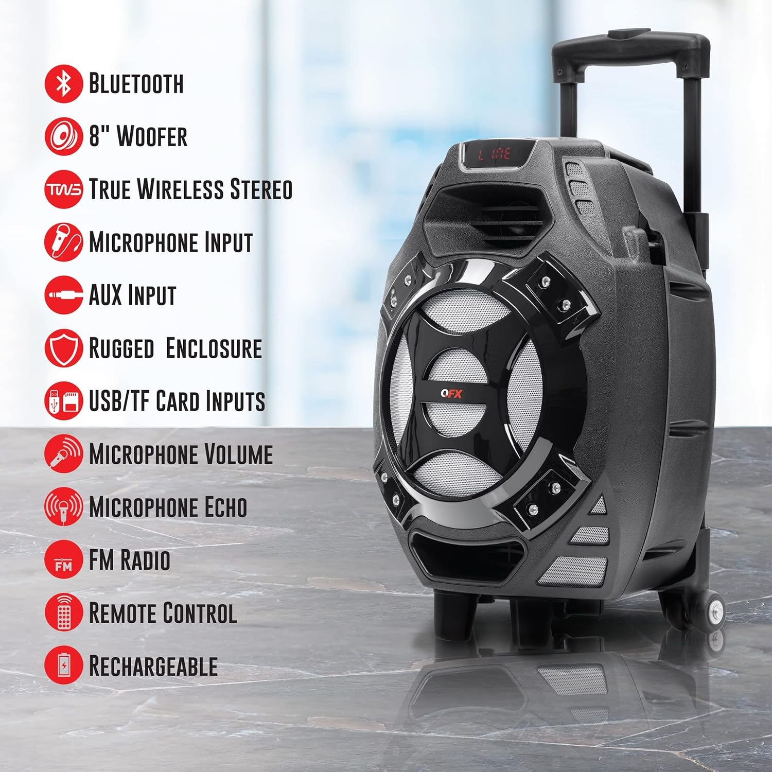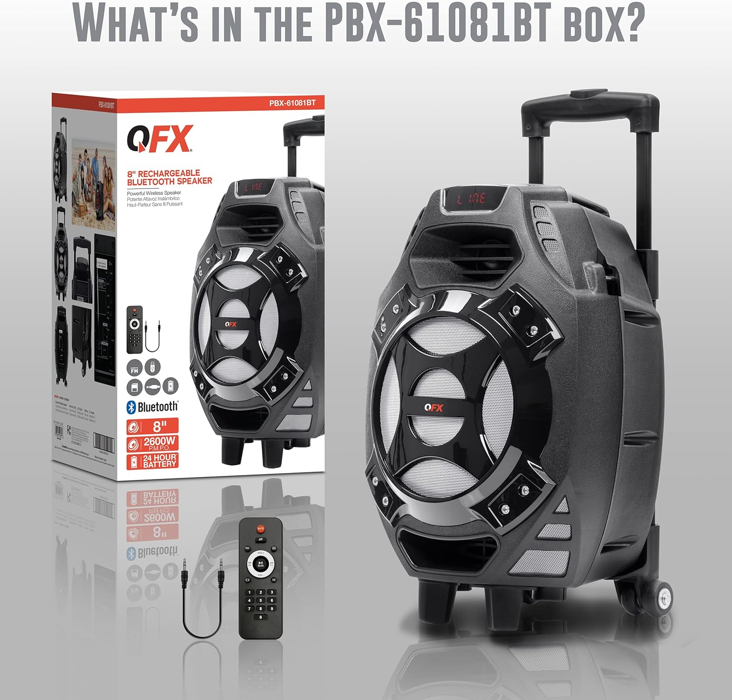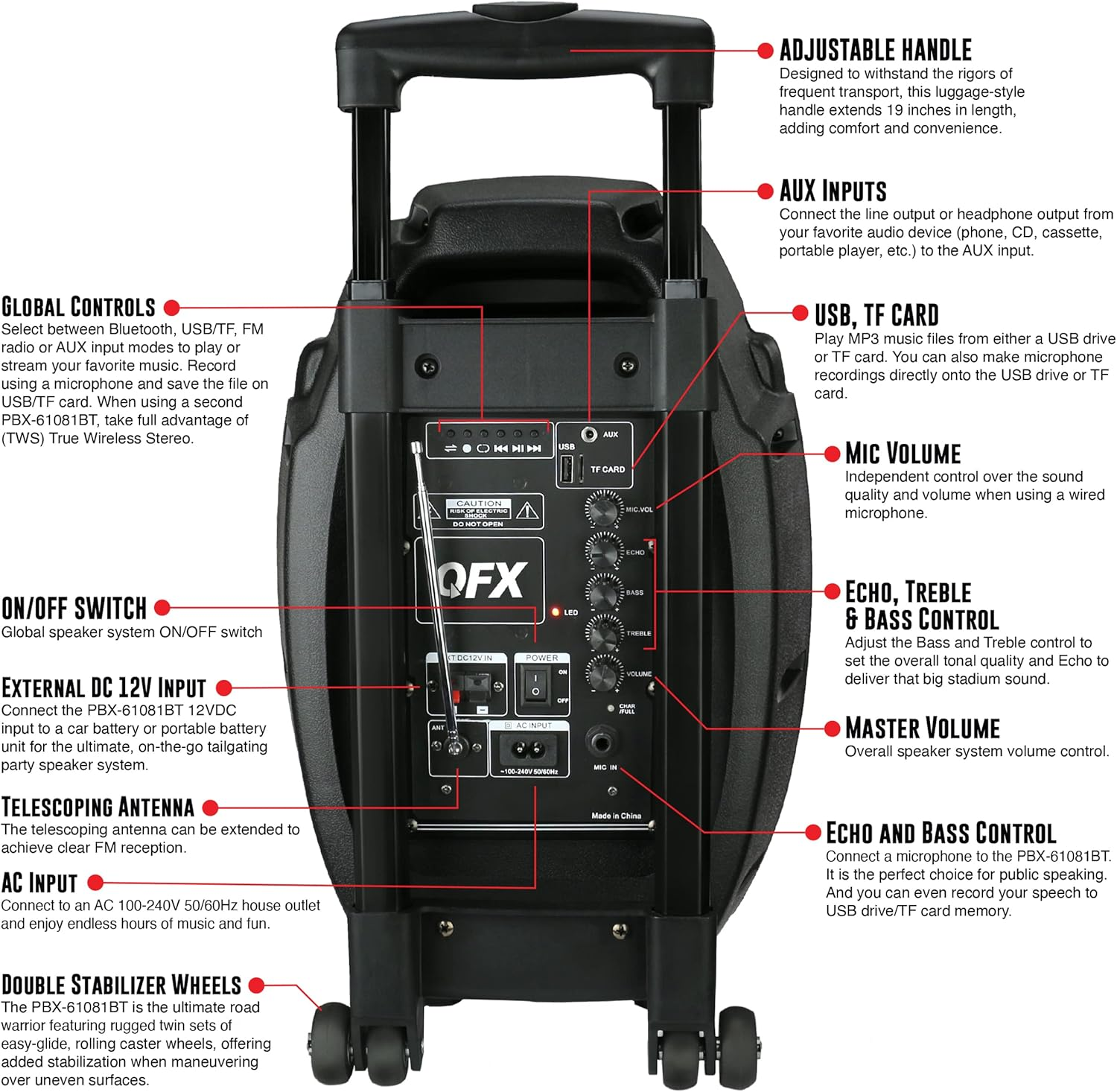 Portable Bluetooth speaker system is your adaptable companion, ideal for celebratory parties, camping adventures, and everyday music enjoyment; Enjoy the music wherever you go Boasts an 8-inch subwoofer that is meticulously crafted to create an immersive auditory experience, delivering thrilling sounds for the ultimate listening enjoyment Experience the utmost convenience while enjoying your favorite tunes through multiple options, including Bluetooth, auxiliary input, FM radio, and USB or TF ports Utilize the integrated carrying handle and wheels for effortless portability, enhancing your on-the-go convenience; Easily transport your device wherever you need it Includes a speaker system, UL adapter, and remote control; Dimensions measure 11 inches in length, 11 inches in width, and 17 inches in height, with a weight of 10.6 pounds Product Description UNLEASH BIG SOUND ANYWHERE WITH THE PBX-61081BT, THE ULTIMATE TAILGATE SPEAKER! What’s a tailgate party without a great sounding, rechargeable Bluetooth wireless speaker. The PBX-61081BT is designed for easy transport, it has dual wheels and a retractable luggage-style handle. Stream music from your phone, listen to the radio, or play files from USB and memory cards. PBX-61081BT FEATURES Rechargeable Bluetooth Protable Speaker 8" Woofer MIC & AUX Inputs USB/TF Card Ports MIC Echo & FM Radio NEXT LEVEL TAILGATING Crank up your tailgate! Stream wirelessly via Bluetooth or plug in a mic to cheer on your team and take the party to the next level! TRUE WIRELESS STEREO (TWS) The TWS feature allows you to connect two PBX-61081BT speakers to simultaneously play music creating the ultimate wireless surround sound experience. UP TO 30FT OF CONNECTIVITY Enjoy wireless freedom with Bluetooth connectivity up to 30 feet, letting you stream music easily from your device while moving around at your event. The perfect speaker for camping, house, or backyard parties. Boost your party atmosphere without hauling heavy speakers. This portable, rechargeable speaker is easy to transport and delivers punchy, room-filling sound. Pair it with another PBX-61081BT and enjoy True Wireless Stereo (TWS) sound! FEATURES MOBILITY TAILGATING RUGGED ENCLOSURE