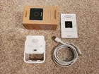 One white Petcam Cam pet monitor with full HD video, night mode, 2-way sound. Includes camera and stand/mounting bracket, USB power cord, plug-in USB converter, and instructions. Uses Petcube app on your Android or Apple device to see, hear, and talk to your pet from anywhere - or use it for low-cost home surveillance. In original packaging. Full HD live-streaming video - Cam delivers a sharp 1080p HD live streaming video with a 110° wide-angle view for full-room coverage. For details, see up close with 8x digital zoom. Clear night vision - See things clearly up to 30 feet in pitch-dark. The pet-monitoring camera will automatically switch to night vision in low light and no light conditions. Smooth two-way audio system - Say hello, soothe your pet, or prevent destructive behavior. Cam provides a natural, life-like sound for your pet to recognize your voice. Smart sound and motion alerts - Get notified in real time about potentially dangerous events, with audio recognition of barking and meowing, and the ability to tell the difference between pets and people. Use double-sided tape to mount to any surface, or just place it on a table or shelf and adjust the camera angle to the view you want.