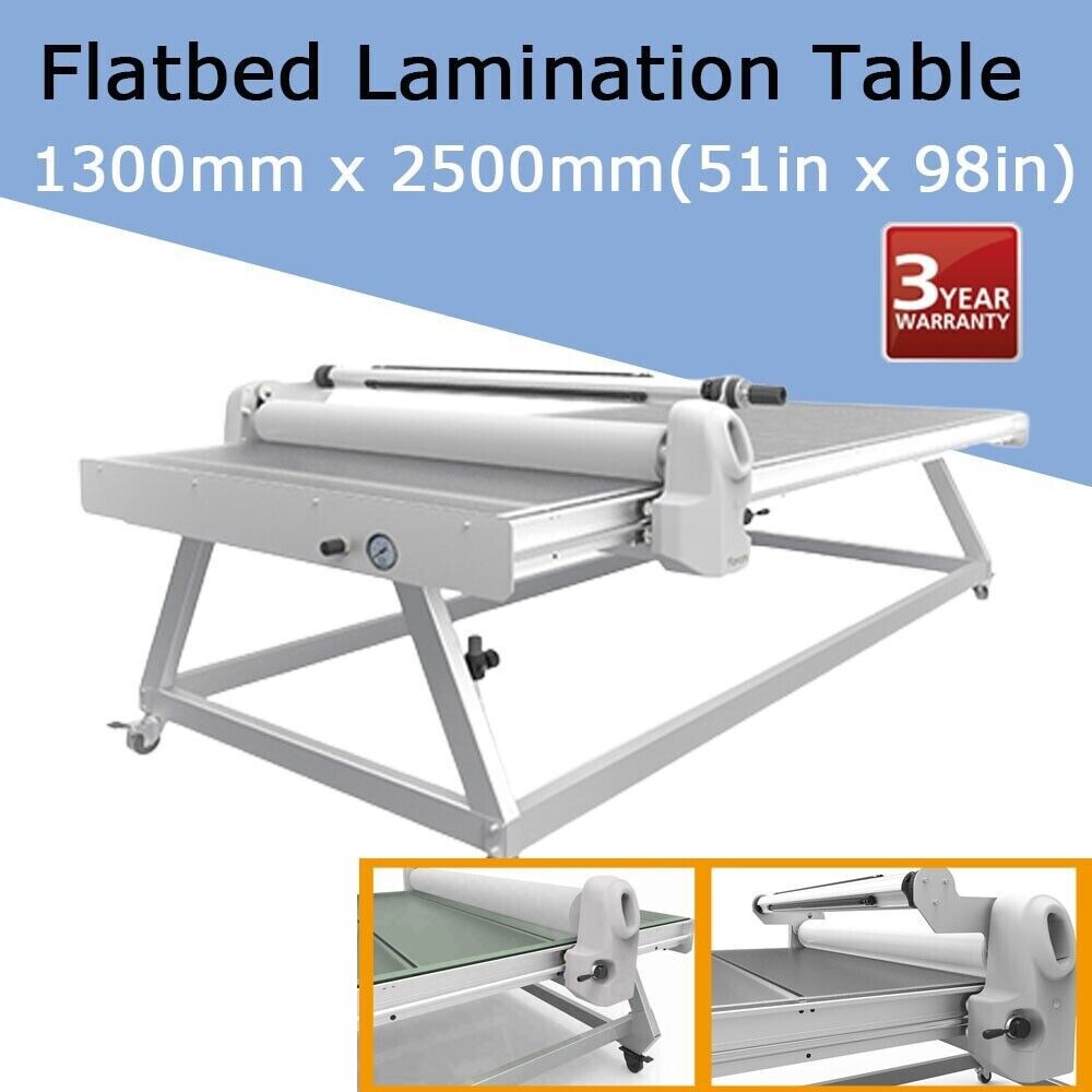 1300mm x 2500mm Flatbed Lamination Table for All Size Prints and Kinds of Board Local Pickup from Illinois Professional Team, 24h Technical Support by Email or Calling! 1300mm x 2500mm Flatbed Lamination Table for All Size Prints and Kinds of Board Flatbed laminator designed for the application of foil and all types of self-adhesive vinyl, transfer film , cold lamination and mounting of images on panels.It is an innovative flatbed laminator specially designed to enable easy and precise applications of foil and self-adhesive vinyl on a wide variety of materials (e.g. sheet metal, plastic, glass and banners). It is used as well for panels mounting and industrial applications. 1. 70% faster application to rigid boards 2. The only work bench you will ever need 3. Media holder and compressor included 4. Toughened Anti-Scratch tempered glass bed 5. LED table lighting system 6. Simple structure, easily operate Specification Model FY1325 Max laminating size 1300mm x 2500mm(51in x 98in) Max laminating thickness 50mm Diameter of roller 130mm Material of rollers Silicon dioxide Table glass 10mm temper glass Illumination LED tube illumination Machine frame Alloy aluminum Operation type Manual Roller upgrade Air cylinder Pressure Range 0.8-1.0kw/h Pressure Range 0-0.8Mpa Voltage 220V/110V, 50 / 60HZ Machine Size 2600mm x 1500mm x 1100mm (102in x 59in x 43.3in) Machine Weight 350kg (772lbs) Package Wooden box Packing size 3100mm x 1900mm x 670mm (122in x 75in x 26.4in) Packing size (Air Compressor) 520mm x 520mm x 220mm (21in x 21in x 9in) Gross Weight 460kg (992lbs) Mounting It only takes one person to mount digital prints or adhesive many form of sub straights. Mount on foam board, corrugated panels, metal panels, banners and glass, all without bubbles. Work Station Of course, the surface can also be used for any of your signage uses. Trimming graphics, doing layouts, weeding. The smart table can be a great support for your shop in speeding up jobs and efficiency. Roller Silicone Imported silicone roller 130mm diameter 6mm silicone thickness. Heat resistance; wear resistance, aging resistance, moisture resistance, good elasticity, no pollution, and no deformation. Tempered glass table The flatbed machine is used by 10mm Tempered glass Samples: Package: