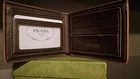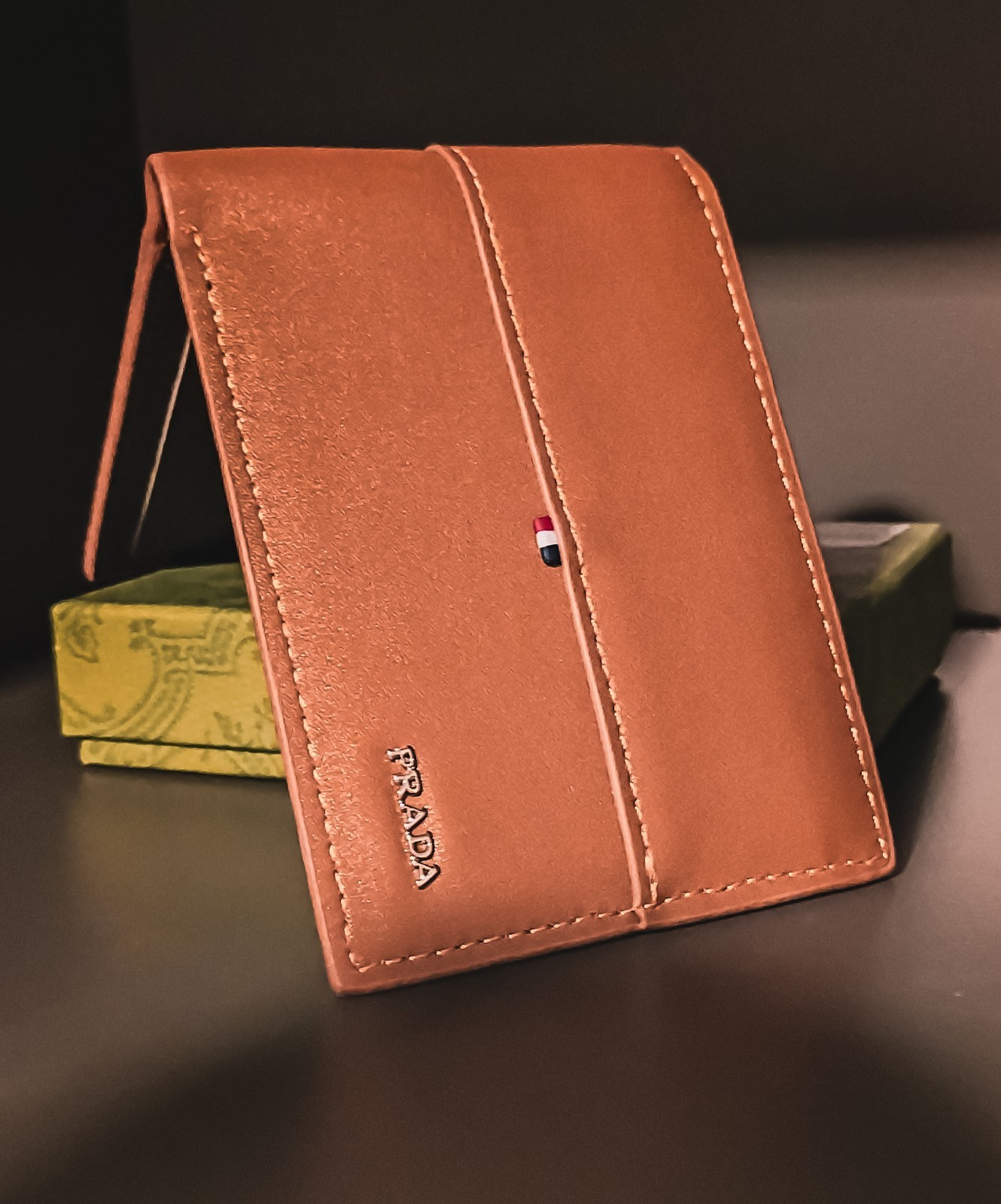 Prada brand-new, display model, vintage, Camel tan bifold wallet, slim in camel brown with a grained texture. Features logo-stamped interior, a rectangular shape, six card slots, and two inside wallet dollar sleeves. Authentic Certificate inside, Milano. Miami Model Society South Beach Retailer