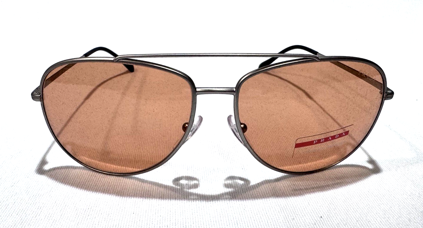 The PRADA SPORT Matte Silver Aviator Sunglasses PS55US - QFP291 are authentic, new eyewear designed for both men and women. These stylish sunglasses feature anti-reflective polycarbonate lenses in rose brown, housed in a matte silver metal frame. With a classic aviator style, these designer sunglasses are perfect for a variety of themes including rock, hippie, retro, and hipster. Made in Italy, these sunglasses have a temple length of 145mm, offering both fashion and functionality for outdoor activities. Size 61-15-145 mm