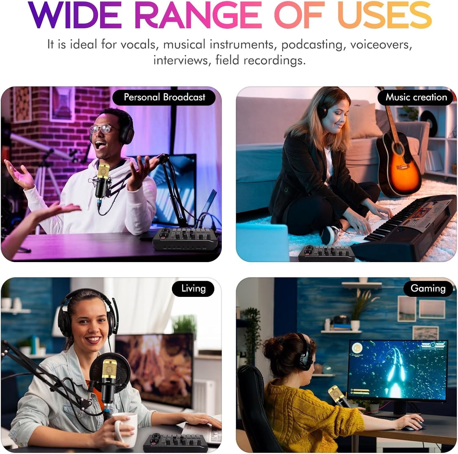 Paquete de equipo profesional para podcast todo en uno: El paquete completo incluye mezclador de interfaz de audio, micrófonos, brazos de micrófono, auriculares de 3.5 mm, soportes antivibratorios, filtros antipop, tapas de espuma, cables XLR, cable USB y cables de audio de 3.5 mm. No requiere compras adicionales. Ideal para principiantes en locución. Excelente calidad de sonido (tecnología de captación cardioide): Mejora tu audio con nuestro paquete de equipo para podcast, que incluye reducción de ruido avanzada y tecnología de captación cardioide. El filtro antipop de doble capa y la tapa de espuma resistente al viento minimizan el ruido de fondo. El mezclador de interfaz de audio integrado ofrece un sonido con calidad de estudio. Tarjeta de sonido F998 recientemente mejorada: Con 16 efectos de sonido de fondo, 7 modos de podcast y grabación, 4 modos de cambio de voz y 9 kinobs ajustables. Perfecto para principiantes en podcast; no se requieren conocimientos de audio. Compatibilidad universal Plug & Play: Este kit de podcast se conecta directamente a PC, smartphones, portátiles, Xbox y sistemas como Windows, Mac OS, iOS y Android. ¡No necesita convertidores ni controladores! Conéctalo y empieza a hacer podcast al instante. Equipo de podcast fácil de usar: Diseñado tanto para principiantes como para profesionales, ¡este paquete de equipo de podcast incluye todo lo que necesitas! Para el primer uso o después de un largo periodo de almacenamiento, carga el dispositivo por completo.