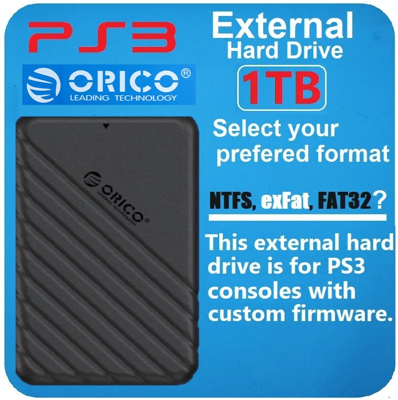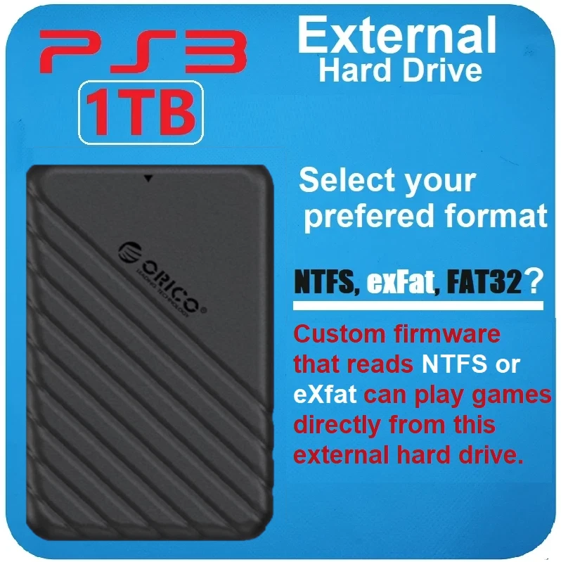 Original PS3 Phat PS3 Slim and PS3 Super Slim external hard drive. 1TB. Cable included.USB 3.0 Sata III. You will need to select the format,NTFS, exFAT Or FAT32 that you want your external hard drive formatted to. Your external hard drive will ship ready for use straight out of the box. Compatible with all PS3 Custom Firmware. Plug and Play no email registration. Condition:The circuit boards, shell and casing are new.The hard drive is refurbished and in excellent condition. Note:This is an actual hard drive meant for long term continuous use, not flash memory or an sd card which are for temporary file storage. Plug and Play no registration, no email signup. PS3 compatible USB 3.0 and 2.0 Cable, included. Ships within 1-2 business days unless otherwise stated in the listing.