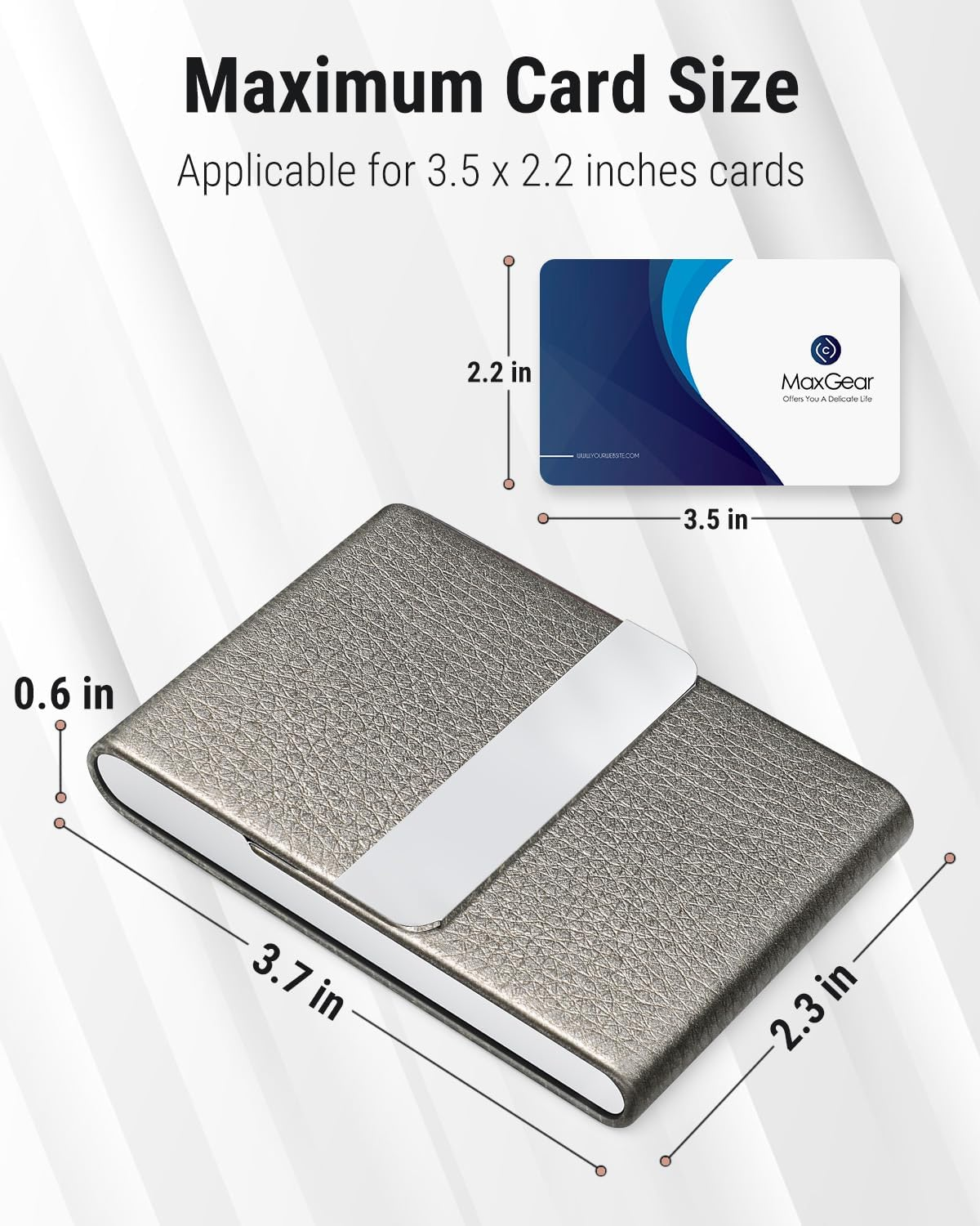 Store New Arrivals Add to Favorite View Feedback Contact Business Card Holder, PU Leather Business Card Case Pocket Card Holders for Men or Women, Metal Slim Name Card Holder RFID Blocking Business Card Carrier with Magnetic Closure, Gray Description Item model number Gray Closure Magnetic Color Gray Is Discontinued By Manufacturer No Product Dimensions 3.7"L x 2.4"W x 0.5"H Material Leather Material Type Leather Manufacturer Part Number -PU-SS-MS-Card Holder-Gray Item Weight 0.15 Pounds Finish Type Smooth Size 3.7"*2.3"*0.65 QUICK ACCESS: Built-in magnetic closure, you can easily access any of the cards stored in there. ULTRA SLIM & COMPACT: Hold about 15-25 business cards (according to the thickness of your cards) or 4-8 credit cards. Minimalist enough that you can fits perfectly in your small pocket, briefcase, handbag. PREMIUM MATERIALS: High quality PU leather combined with stainless steel creates a unique style card case. RFID BLOCKING: RFID secure design protect your cards from unwanted wireless communication. BEST GIFT: It can be a great present for yourself or the one you love. Please feel free to contact us if you have any question about our business card case. Product Description 1 PROFESSIONAL & BUSINESS 2 SLIM & ELEGANT 3 COMPACT & PORTABLE MaxGear Professional Business Card Case Add to Cart Add to Cart Add to Cart Add to Cart Add to Cart Add to Cart Add to Cart Customer Reviews 4.7 out of 5 stars 12,200 4.7 out of 5 stars 12,200 4.7 out of 5 stars 17,417 4.6 out of 5 stars 8,005 4.6 out of 5 stars 830 4.8 out of 5 stars 445 4.4 out of 5 stars 1,129 Price $6.99 $ 6 . 99 $7.99 $ 7 . 99 $7.99 $ 7 . 99 $9.99 $ 9 . 99 $8.99 $ 8 . 99 $5.99 $ 5 . 99 $8.99 $ 8 . 99 Color Gray Pink Stainless Steel Black Clear Black Black Material PU Leather + Stainless Steel PU Leather + Stainless Steel Black PU Leather PP Plastic PU Leather + Stainless Steel Aluminum Capacity 15-25 Business Cards 15-25 Business Cards 10-20 Business Cards 15-25 Business Cards 10-20 Business Cards 10-20 Business Cards 22-30 Business Cards Size 3.7 x 2.4 x 0.5 inches 3.7 x 2.4 x 0.5 inches 3.8 x 2.4 x 0.4 inches 3.9 x 2.5 x 0.7 inches 3.9 x 2.5 x 0.4 inches 3.7 X 2.4 X 0.5 inches 3.7 x 2.45 x 0.6 inches Feature Slim, Elegant, Exquisite Slim, Elegant, Exquisite Portable & Large Capacity Fashion, Compact & Portable Durable & Safe, Lightweight Slim & Elegant & Durable Lightweight & Fashionable Policy on Product Sourcing and Fulfillment Dear Valued Customers, We would like to clarify an important aspect of our business operations to ensure transparency and trust in our relationship with you. Product Fulfillment: Fulfillment by Amazon (FBA): The products are stored in Amazon Fulfillment Centers. This storage solution ensures that the inventory is kept in a secure and climate-controlled environment, which helps maintain the quality and safety of the products. Efficient Delivery: Utilizing Amazon's fulfillment services allows us to leverage their robust logistics network to provide you with fast and reliable shipping. This means you receive your purchases in a timely manner with the added assurance of Amazon's trusted delivery systems. Customer Assurance: Quality Control: Every product is carefully selected and undergoes rigorous quality checks before being listed for sale. Our commitment is to provide you with high-quality items that meet your expectations. Secure Storage: Amazon's Fulfillment Centers are renowned for their high standards of security and efficiency. Your products are stored safely until they are shipped to you. Customer Support: Should you have any questions or concerns regarding your purchase, our customer support team is readily available to assist you. We are dedicated to ensuring your satisfaction with every transaction. We appreciate your business and are committed to providing you with a seamless and satisfactory shopping experience. Thank you for your trust and understanding. Sincerely, -Manager- Shipping Policy and Expectations Dear Valued Customers, We are committed to ensuring that your package arrives as quickly as possible. However, we kindly ask for your understanding regarding certain factors that may occasionally affect shipping times. Our Commitment: Prompt Processing: We strive to process and dispatch your orders promptly to minimize any delays. Reliable Shipping Partners: We work with reputable shipping companies to ensure your packages are handled with care and delivered efficiently. External Factors: While we do everything within our power to expedite your order, please note that some factors are beyond our control: Weather Conditions: Severe weather can impact shipping routes and cause delays. High Postal Traffic: During peak seasons, such as holidays, the increased volume of packages can lead to longer delivery times. Shipping Company Performance: The performance and schedules of shipping companies may vary, potentially affecting delivery times. We appreciate your patience and understanding in these situations. Rest assured, we are doing everything possible to get your package to you as soon as possible. Customer Support: If you have any questions or concerns about your order, please do not hesitate to contact us. Our customer support team is here to assist you and provide any necessary updates on your shipment. Thank you for your trust and continued business. Shipping Policy and Customer Satisfaction Shipping Information: Service Area: We offer shipping to the lower 47 states. Please confirm with us about the delivery date before completing your purchase. Thank you. Address Requirements: We do not accept P.O. Boxes. Please provide a physical address for delivery. Shipping Restrictions: Unfortunately, we are unable to ship items to the state of Ohio and California due to shipping agreements and restrictions. International Shipping: eBay International Shipping Hub: For shipping outside of the continental USA, we only use eBay's International Shipping Hub. The item is shipped to Illinois