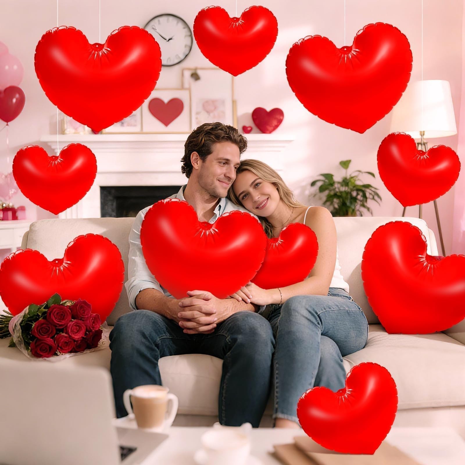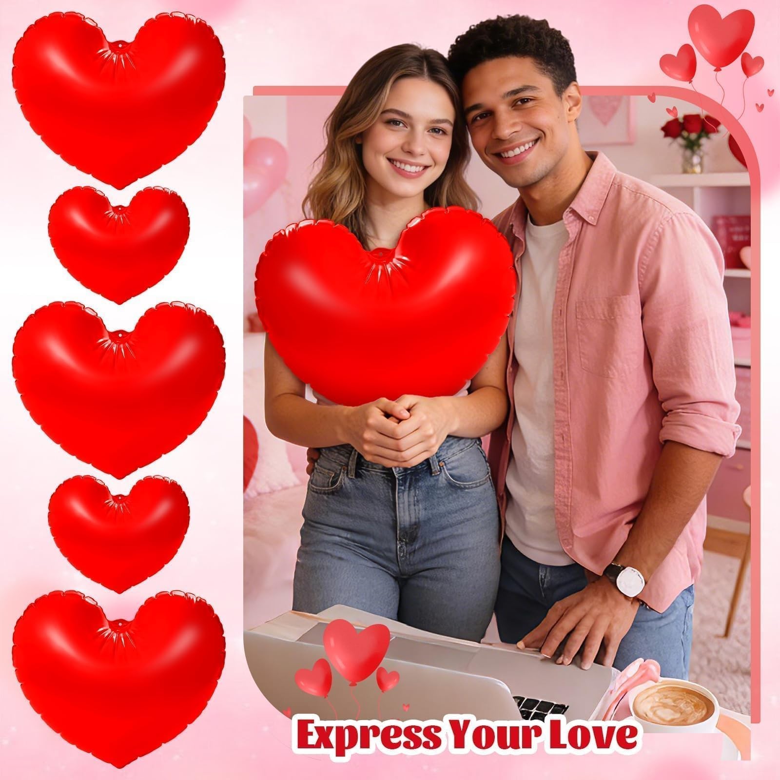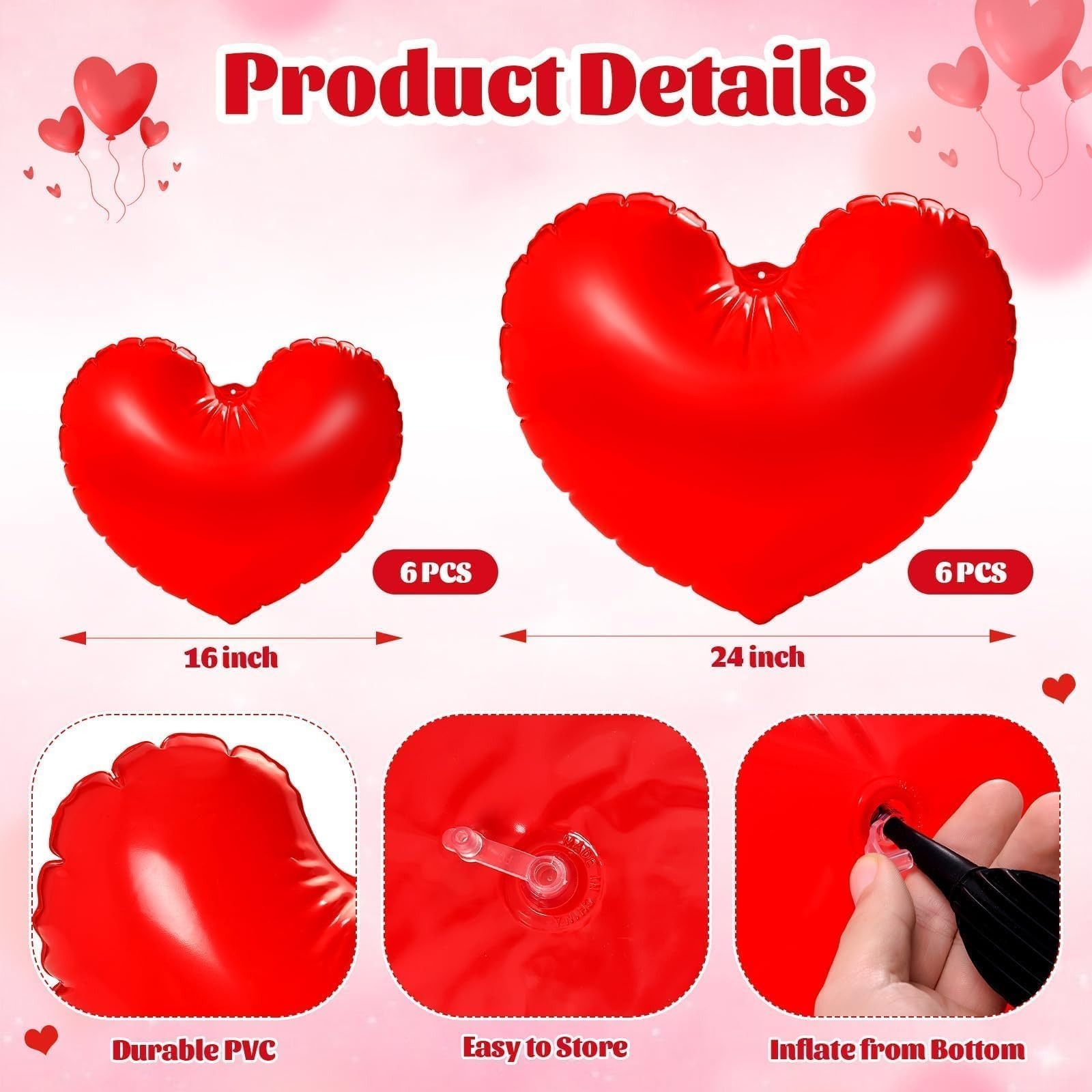 PYURTHITY 12 Pcs 16'' and 24'' Giant Valentine's Day Inflatable Heart red Description Features:Easy Setup:Simply inflate these Valentine's Day heart yard decorations using an air pump (not included) for quick decoration and party preparation.Hang these heart shaped inflatable balloons in your home, front door, porch, or windows to welcome guests with a warm and inviting ambiance.Specifications:Material: PVCColor: redSize: 16 inches, 24 inchesPackage include:12 x Valentine's Day inflatable heart decorationsNotes:Manual measurement, please allow slight errors on size.The color may exist a slight difference due to different screen displays. Features: Plenty of Love: The package includes 12 pieces Valentine's Day inflatable heart decorations and 1 piece 16.4-foot/5-meter long rope, providing ample quantity to meet all your decorating needs. Share these love-filled blow up heart with friends and loved ones on this special day to spread the love Eye Catching Sizes: Our giant Valentine's Day hanging hearts for outdoor come in 16-inch and 24-inch sizes, with 6 of each size included. The large Valentine's Day heart decorations make a bold statement when hung on trees, walls, or entrances, effortlessly adding romantic ambiance to your space Quality Material: Crafted from quality PVC, these inflatable Valentine's Day decorations are durable and feature a smooth, burr-free surface. Waterproof and abrasion-resistant, they resist punctures and fading. Easy to inflate, they offer long-lasting use to accompany you through multiple holidays Valentine's Day Design: These heart shaped decorative ornaments feature vibrant red hues and classic heart shapes for both beauty and romance. Their large size and eye-catching colors elevate Valentine's Day ambiance in any indoor or outdoor space, making your decor more captivating Versatile Use: Our large hanging hearts are ideal for Valentine's Day celebrations and also add sparkle to anniversaries, weddings, costume parties, bridal showers, baby showers, birthday parties, and more. They blend seamlessly into any love-filled celebration, creating a romantic ambiance in homes, patios, gardens, or lawns Product Details: Handling We will ship all orders within 1 business day of payment. Delivery We Do Not Ship Outside of the Continental US. Return Policy All items qualify for returns within 30 days of receipt. Buyer is responsible for return shipping on any item that is not damaged. Feedback We take our reputation seriously, we buy and sell online, so we understand the value of trust. If you are unsatisfied with your order, please contact us and we will work with you to resolve it to your satisfaction.