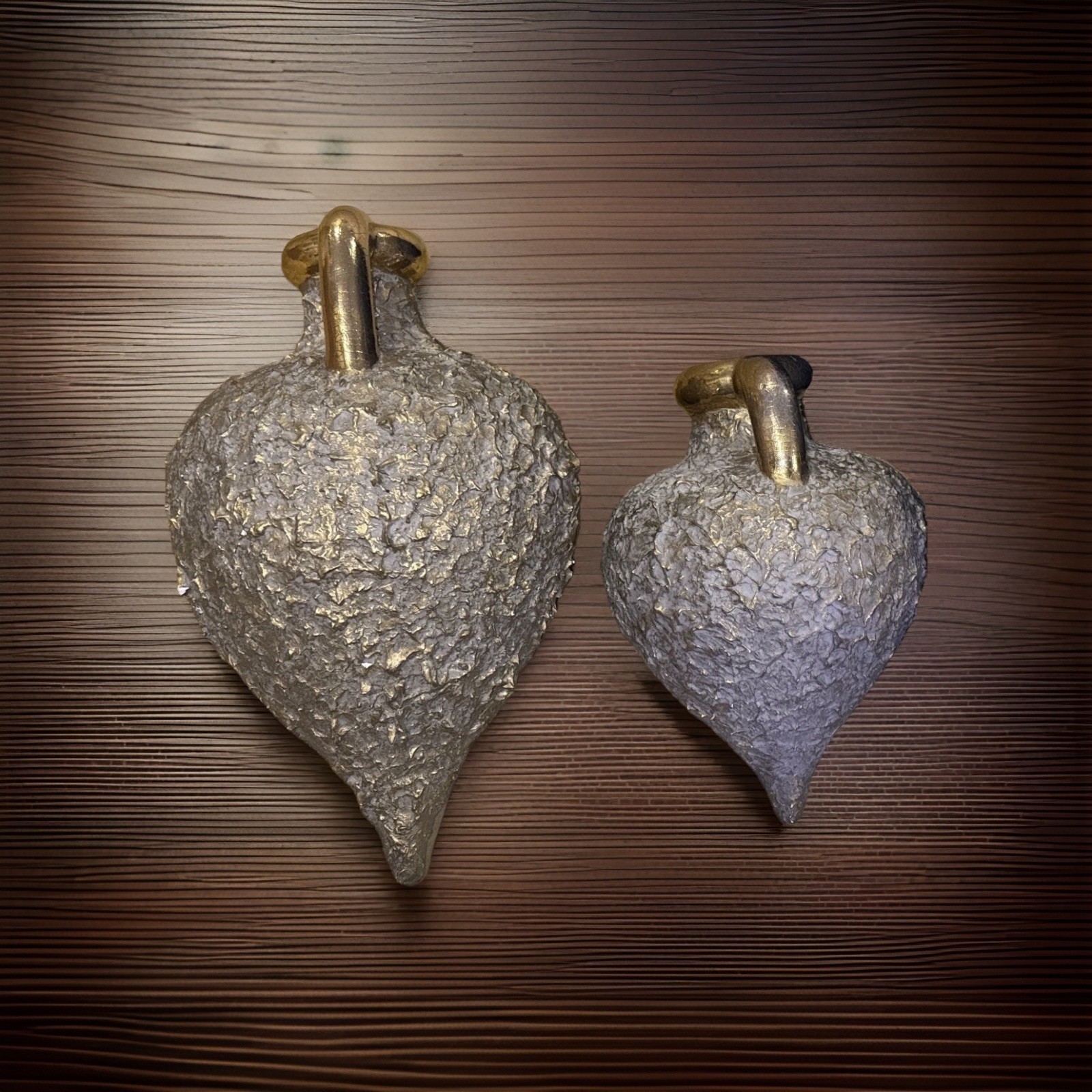 Pair of large sculptural ceramic vases featuring a striking brutalist design with heavily textured stoneware bodies and metallic gold glazed handles. Each vase is solid and substantial, with an angled neck and hollow interior, designed to rest on a diagonal for a bold, modern presentation. These pieces have wonderful presence and work beautifully as statement décor on a console, shelf, or tabletop. Both vases are in very good overall condition. Upon close inspection, there are a few extremely minor edge flecks typical of stoneware production and handling, but nothing that detracts from their appearance. They display beautifully. Approximate measurements: Larger vase: about 14” x 10” Smaller vase: about 11” x 8” ✨ Thank you for taking a look! If you think this could be your next purchase, don’t hesitate to make an offer — I truly enjoy connecting special treasures with the people meant to have them. ✨ Your item will be carefully packaged to ensure it arrives safely. Buy with confidence — I’m proud to maintain 100% positive feedback!