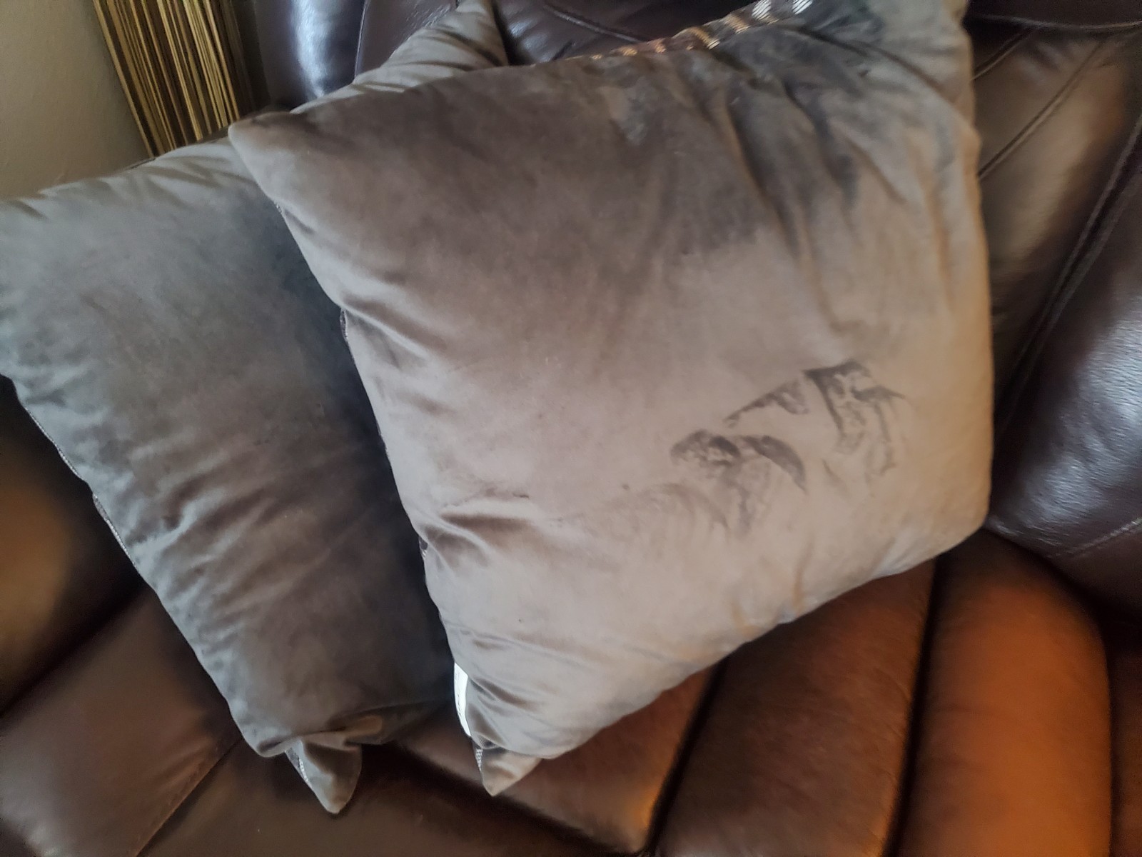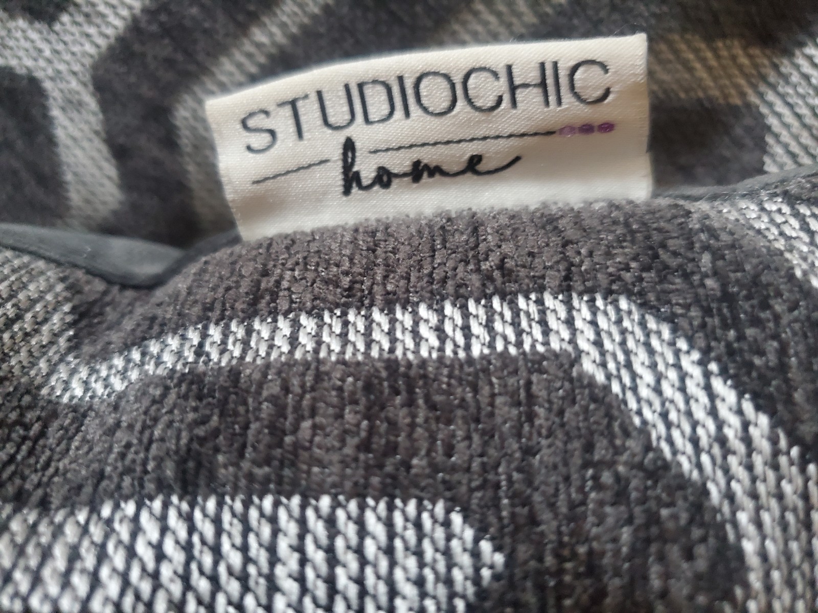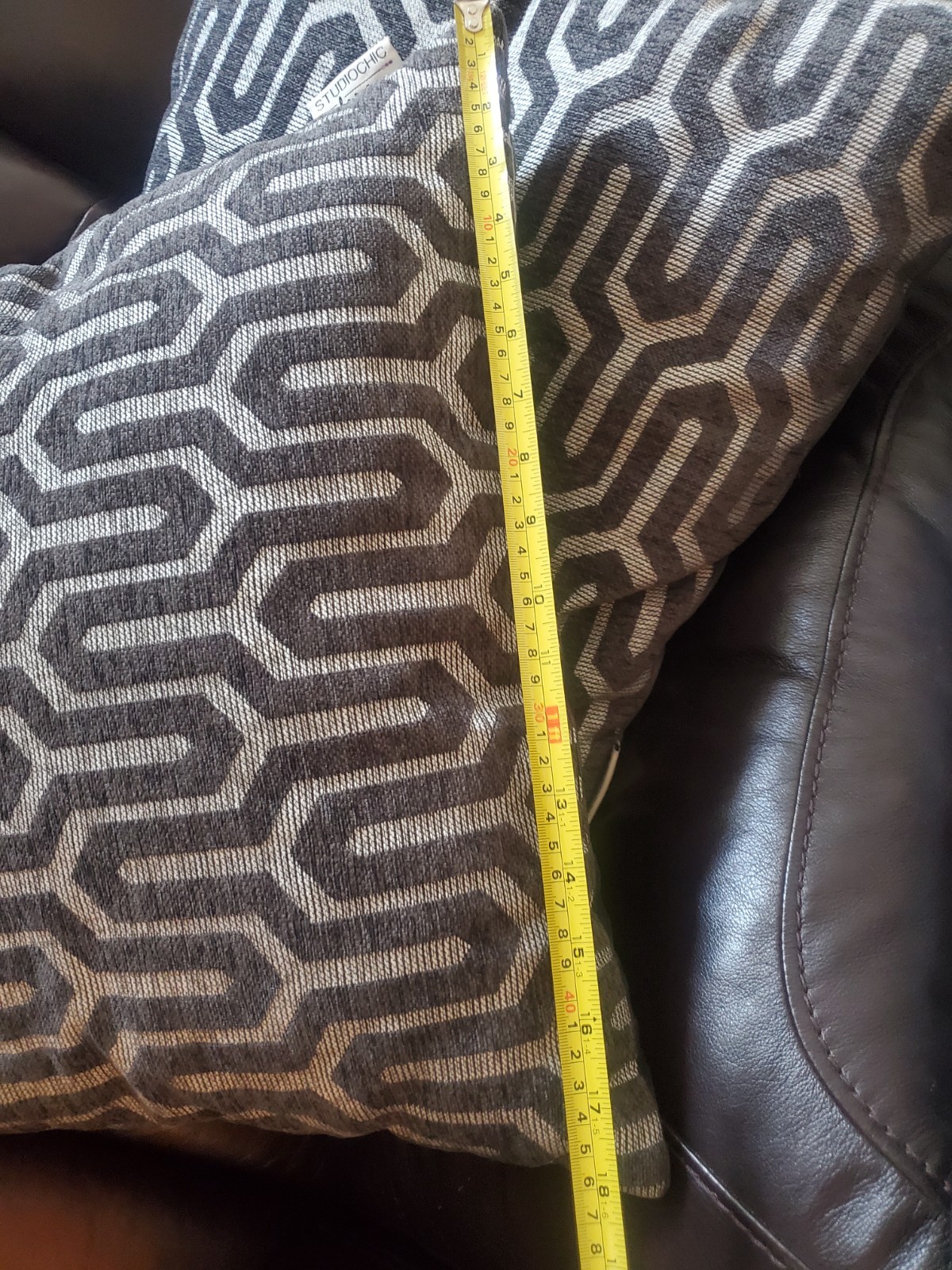 Add versatile style to your living space with this unique pair of 18x18 inch Studio Chic Home decorative throw pillows. These pillows offer two distinct looks: one side features a stylish gray and white geometric pattern in a soft, chenille/cut velvet texture, while the reverse side is a solid, smooth gray velvet. Please note that these are sewn shut with no zipper closure. They are in excellent pre-owned condition, perfect for a couch, sofa, or bedroom accent."