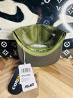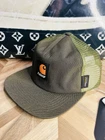 This is a rare and sold out Palace x Carhartt Hat in olive green color. It is a Cordura Mesh SnapBack with an upside-down logo featuring various exclusive and unique designs like Ecapcity, Vhs, and Stained Glass. Made of 100% polyester fabric in one size fits all, perfect for men who appreciate high-quality and stylish hats.