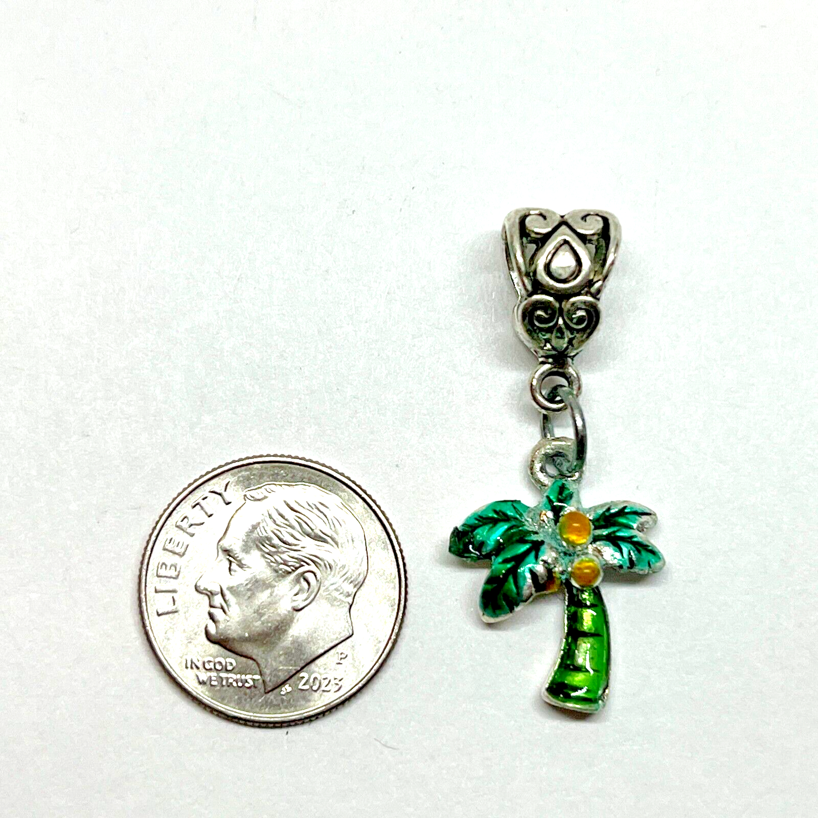 VINTAGE PALM TREE DANGLE CHARM Fits Pandora and European snake chain bracelets as well as thicker cords and necklace chains. CHARM DETAILS: Charm Metal: Silver Plated Finish Color: Multi-color Size: Compare photo with dime Style: Concave Available without bead attached upon request Snake bracelet not included SHIPPING: Shipping within the USA is free. Please refer to the estimated delivery date during checkout. Handling time is one business day.