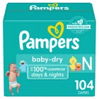Highlights Up to 100% leakproof nights and happy mornings with LockAway Channels Helps prevent blowouts with stretchy sides and large tape fasteners for a secure and comfortable fit Helps keep skin dry and healthy with Dri-Weave Liner Trusted protection-from Pampers #1 pediatrician recommended brand Gentle on baby's delicate skin-hypoallergenic and free of parabens and latex* (*Natural Rubber) New and improved! Packaging and prints may vary Use with Pampers Baby Fresh Wipes for healthy skin Description A good night's sleep starts with a great diaper, and Pampers Baby-Dry diapers give you and your baby up to 100% leakproof nights and happy mornings. Made to protect your baby's delicate skin, our exclusive LockAway Channels absorb wetness and lock it safely away, while our protective Dri-Weave Liner helps keep skin healthy. Plus, our Baby-Dry Diapers are hypoallergenic and completely free of parabens and latex.* These are just a few of the many reasons Pampers is the #1 pediatrician recommended diaper brand-and your baby's best bet for comfy protection. Pampers also keep messes to a minimum. To help contain leaks and prevent blowouts, our Baby-Dry diapers feature all-around stretchy sides and large tape fasteners for a secure and comfy fit. Plus, they come equipped with our Dual Leak-Guard Barriers that are specially designed to protect around the legs, where leaks tend to happen most. And when your baby is due for a diaper change, our handy Wetness Indicator lets you know. No need for guesswork.Use Baby-Dry diapers with our Pampers Sensitive Wipes to help keep your baby's skin healthy and prevent irritation. New & improved! Packaging and prints may vary. Ships in 100% recyclable packaging. *Natural Rubber Specifications Health Facts: Paraben-Free Features: Umbilical Cord Opening, Elastic Stretch Sides, Hypoallergenic, Wetness Indicator Disposability: Do not flush Safety and Security Features: Latex-Free Package Quantity: 104 Diaper Weight Range: Up to 10 lbs Material: Spandex, Polypropylene TCIN: 14721312