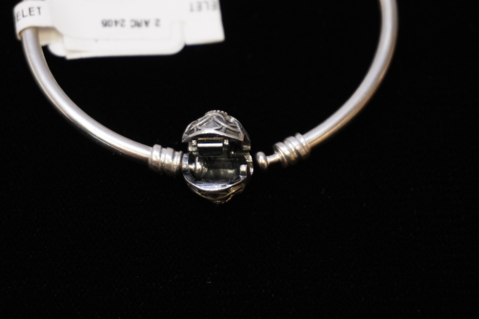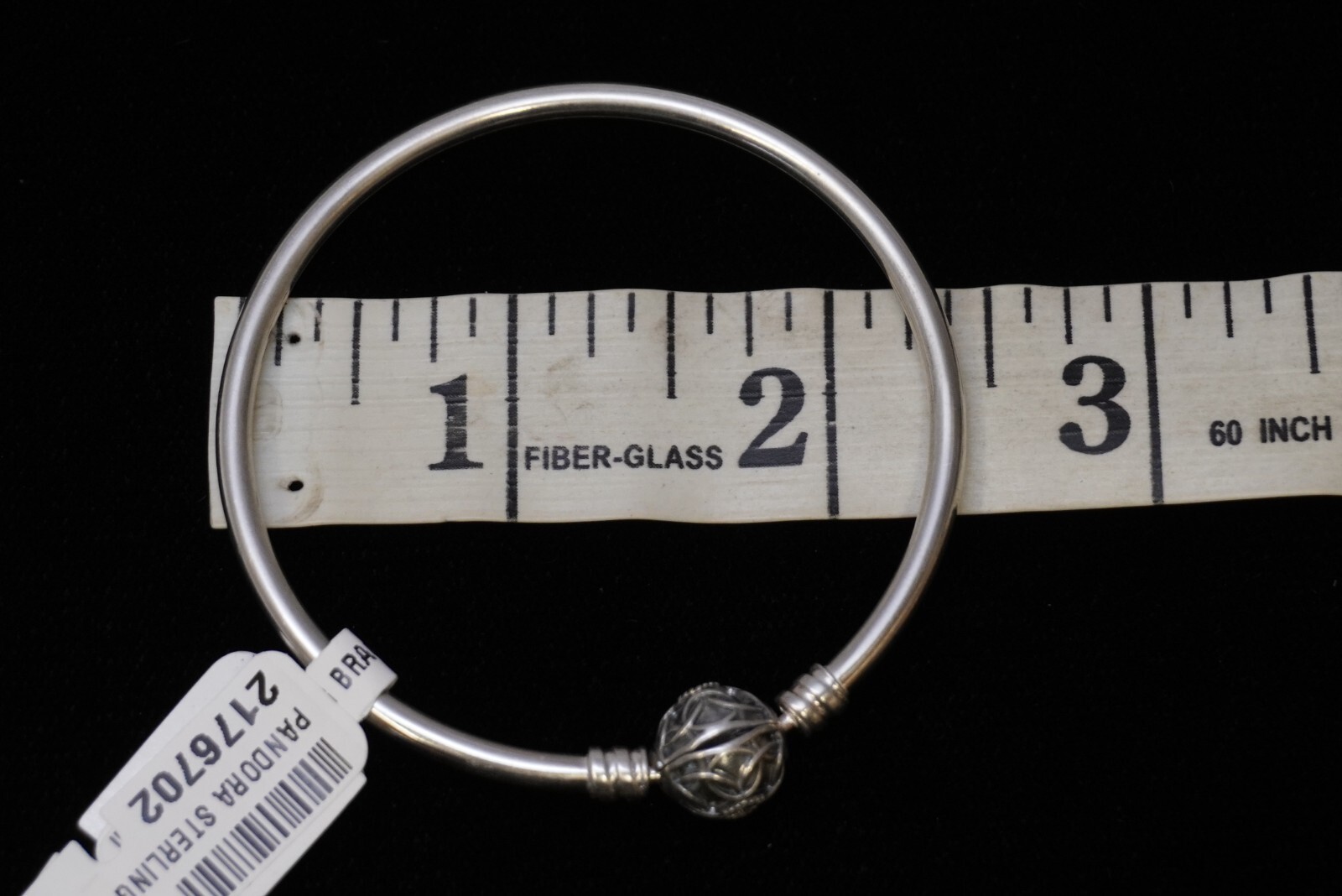 CONDITION: PRE-OWNED THIS PANDORA BANGLE IS IN GOOD CONDITION AND READY TO BE CUSTOMIZED TO YOUR STYLE. ESTIMATED TO FIT A 5.5" WRIST COMFORTABLY. THERE ARE SOME SCUFF MARKS FROM NORMAL WEAR AND TEAR. SEE PHOTOS FOR ADDITIONAL DETAILS OF CONDITION. WITHIN THE UNITED STATES, THIS WILL SHIP USPS AND ITEMS VALUED AT $150 USD AND HIGHER WILL REQUIRE SIGNATURE AT TIME OF DELIVERY. OUTSIDE UNITED STATES, WE OFFER EBAY'S GLOBAL SHIPPING PROGRAM, ONLY. Please See Images For Overall Condition THANK YOU FOR YOUR INTEREST **PLEASE MESSAGE US IF YOU HAVE ANY QUESTIONS REGARDING THIS ITEM, OTHER ITEMS, PURCHASING, OR RETURNS** OUR RETURN POLICY UNITED STATES: 30 DAY RETURNS ACCEPTED. UNLESS WE DETERMINE, OTHERWISE, THE ITEM MUST BE RETURNED TO US BEFORE A REFUND IS ISSUED. ITEMS OF JEWELRY WILL HAVE A TAG PLACED ON THEM PRIOR TO SHIPPING. THOSE ITEMS LISTED AS ?NEW? AND FACTORY SEALED AT TIME OF SALE THAT HAVE BEEN OPENED PRIOR TO RETURNING, FOR ANY REASON OTHER THAN BEING DEFECTIVE, OR, IF THE JEWELRY TAG HAS BEEN DETACHED FROM THE PIECE OF JEWELRY, A FEE OF 25% OF THE SALE PRICE WILL BE REMOVED FROM REFUNDED AMOUNT ONCE THE RETURNED ITEM HAS BEEN RECEIVED AND VERIFIED. CONTACT US FOR ANY RETURN ISSUES INTERNATIONAL COUNTRIES: NO RETURNS ORDERS PAID FOR BEFORE 8 AM EST WILL SHIPPED THE SAME DAY. ALL OTHER ORDERS WILL SHIP WITHIN THE NEXT TWO BUSINESS DAYS. OUR EBAY OFFICE IS OPEN 7 AM - 3 PM E.S.T. MONDAYS THRU FRIDAYS EXCEPT ON HOLIDAYS. WE THANK YOU FOR YOUR PATIENCE AND WILL RESPOND TO YOUR INQUIRIES AND CONCERNS WHEN BACK IN OFFICE.