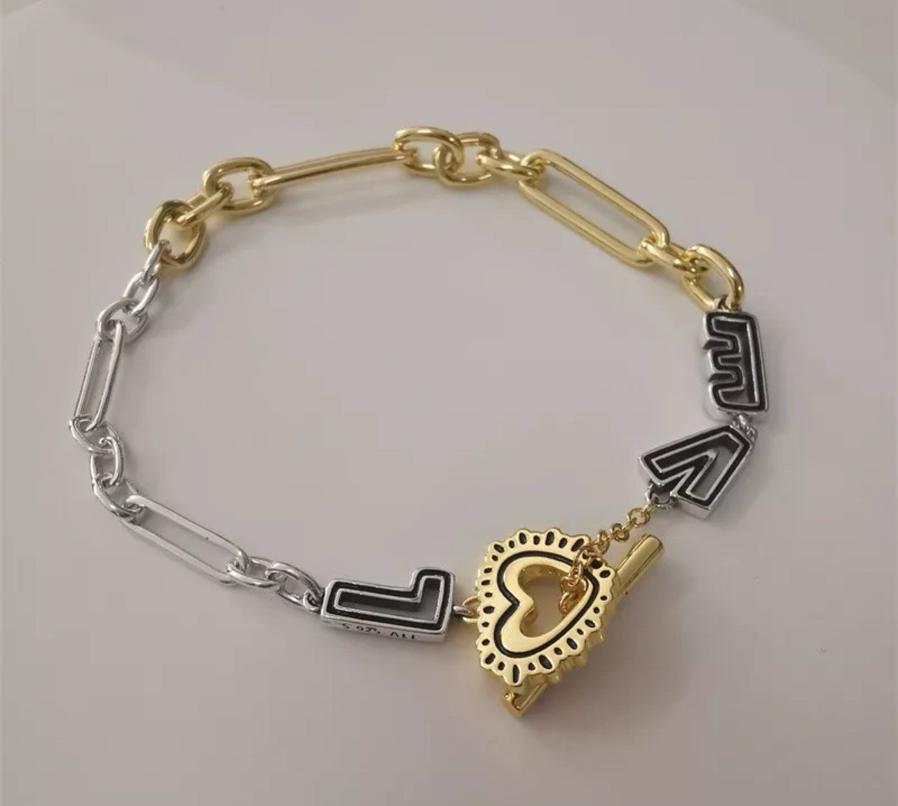 New comes with bracelet and dust bag. The Pandora Keith Haring™ x Pandora Two-tone Love Links Bracelet 562223C01-21 Cm is a stunning piece of jewelry that combines the iconic Keith Haring designs with the signature Pandora quality. This bracelet features a beautiful two-tone design with gold accents, making it perfect for special occasions like Mother's Day, weddings, and birthdays. The T-bar closure ensures a secure fit, while the S925 sterling silver and gold plated materials ensure durability and longevity. Made in Thailand, this bracelet is a timeless piece that celebrates love and style.
