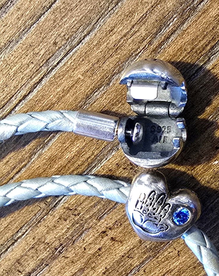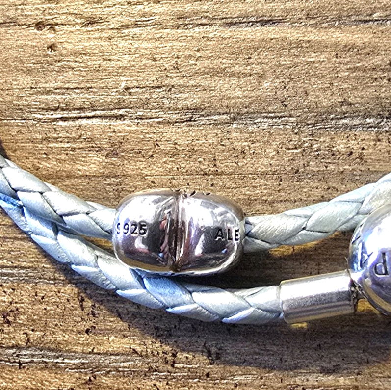 This is a Pandora wrap bracelet, braided pale blue leather with a pearlescent finish and Pandora sterling silver clasp. Included is a retired heart shaped sterling "Its a boy" bead with blue crystal stone. Condition is very good, wear is faint. Thanks for looking! Please ask any questions BEFORE purchasing, and see my other listings for more!