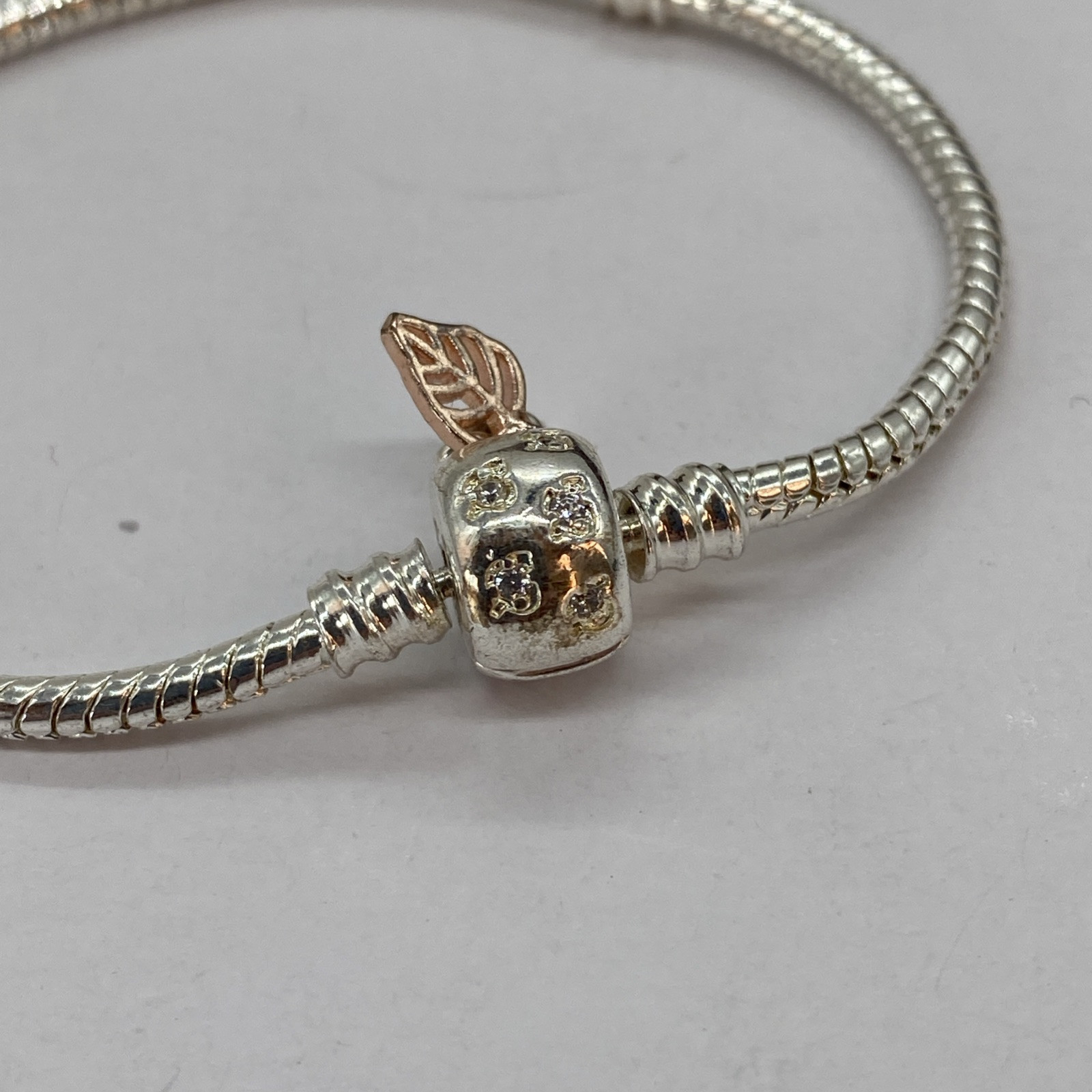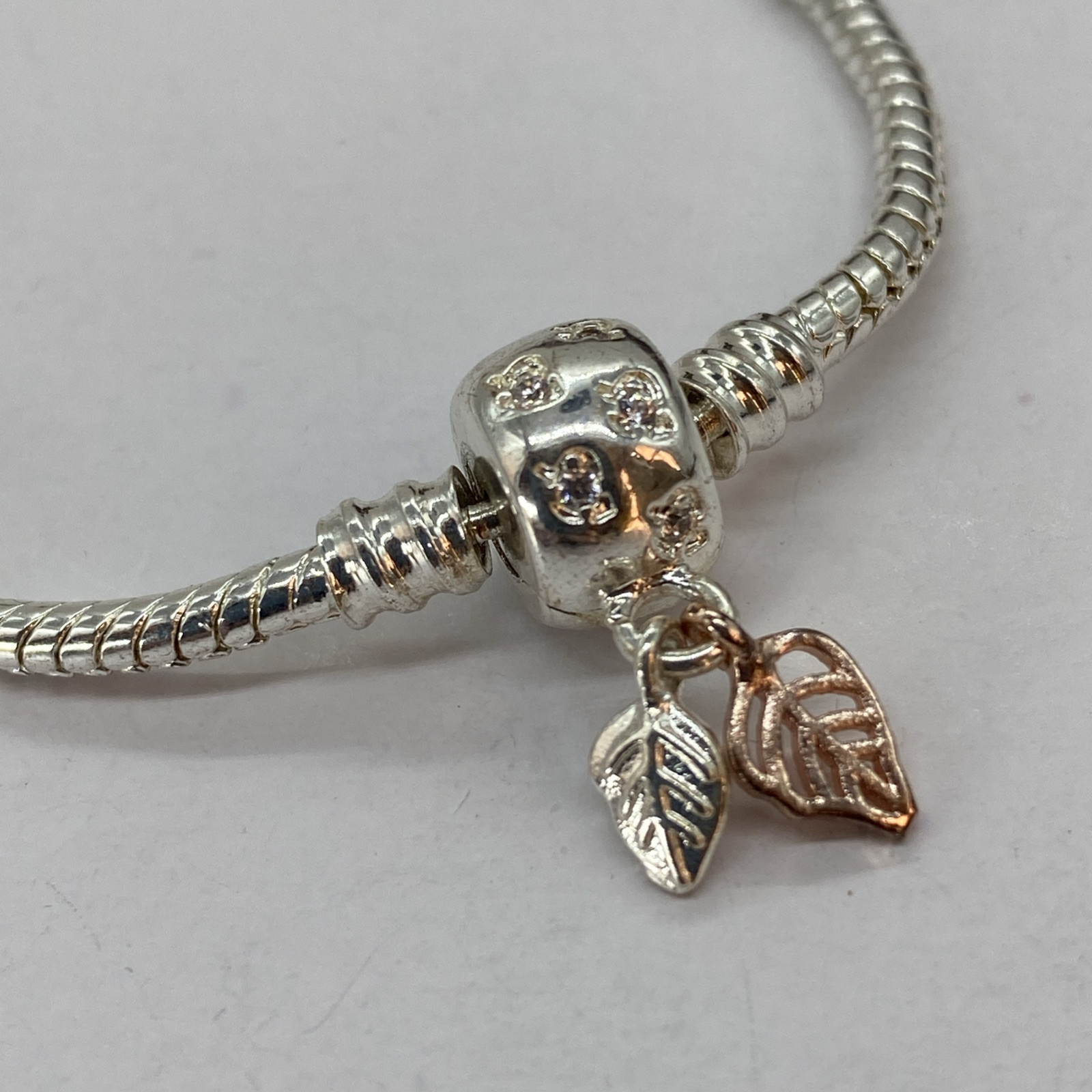 This stunning silver bracelet features a delicate snake chain with elegant leaves, one in a beautiful copper tone. The Pandora-style clasp adds a luxurious touch, and the 17.5cm length makes it a perfect fit. The design is identical to Pandora’s Moments collection—gorgeous and timeless! The photos show every detail, and it looks just as elegant in person. A fantastic find for anyone who loves subtle, chic jewelry!