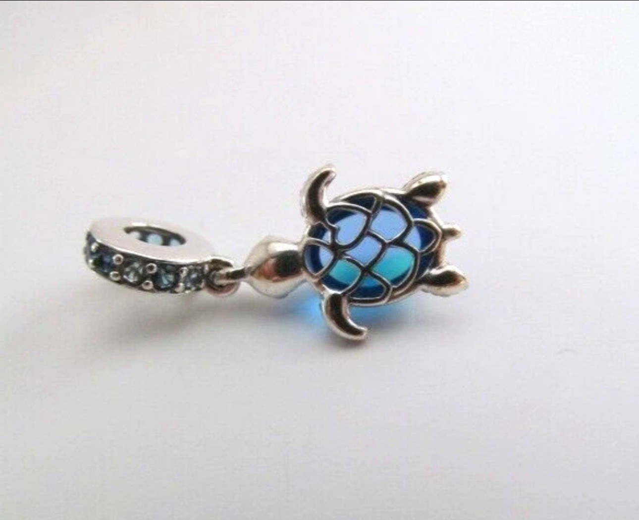 Comes with charm and dust bag. Add a touch of ocean-inspired elegance to your Pandora bracelet with the #798939C01 Murano Glass Sea Turtle Dangle Charm. Crafted with care in Thailand, this charm features a stunning round blue Murano glass stone that captures the light with every movement. The sterling silver construction, accented with .925 metal purity, provides a durable and classic base for the intricate turtle design. Perfect for a variety of occasions, this charm is a versatile addition to any jewelry collection. Whether it's an anniversary, birthday, or holiday gift, the dangle charm's stackable feature ensures it can be easily mixed and matched with other favorites. The charm's length is 16.5 mm, with a width of 13.4 mm, making it a statement piece without overwhelming your existing bracelets.