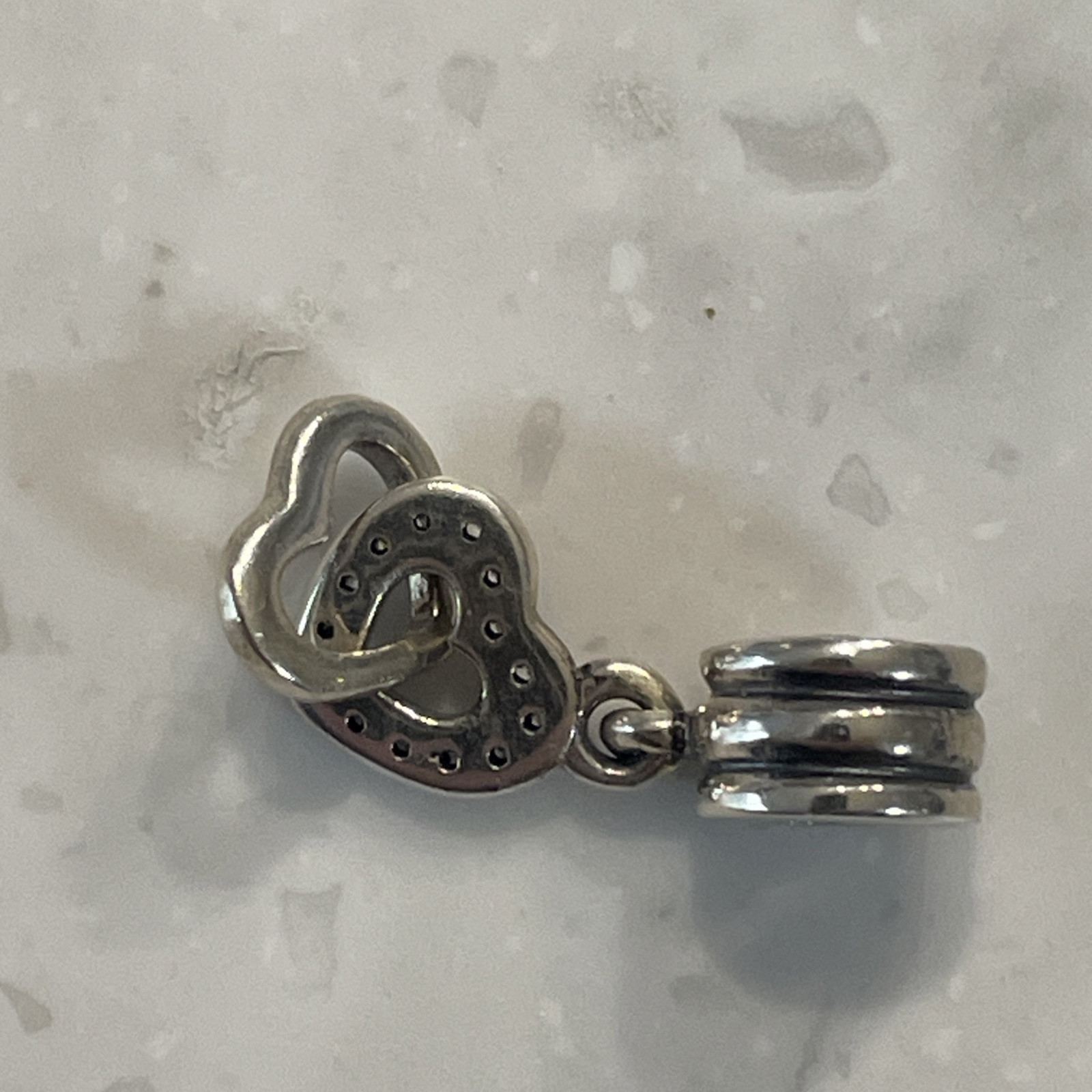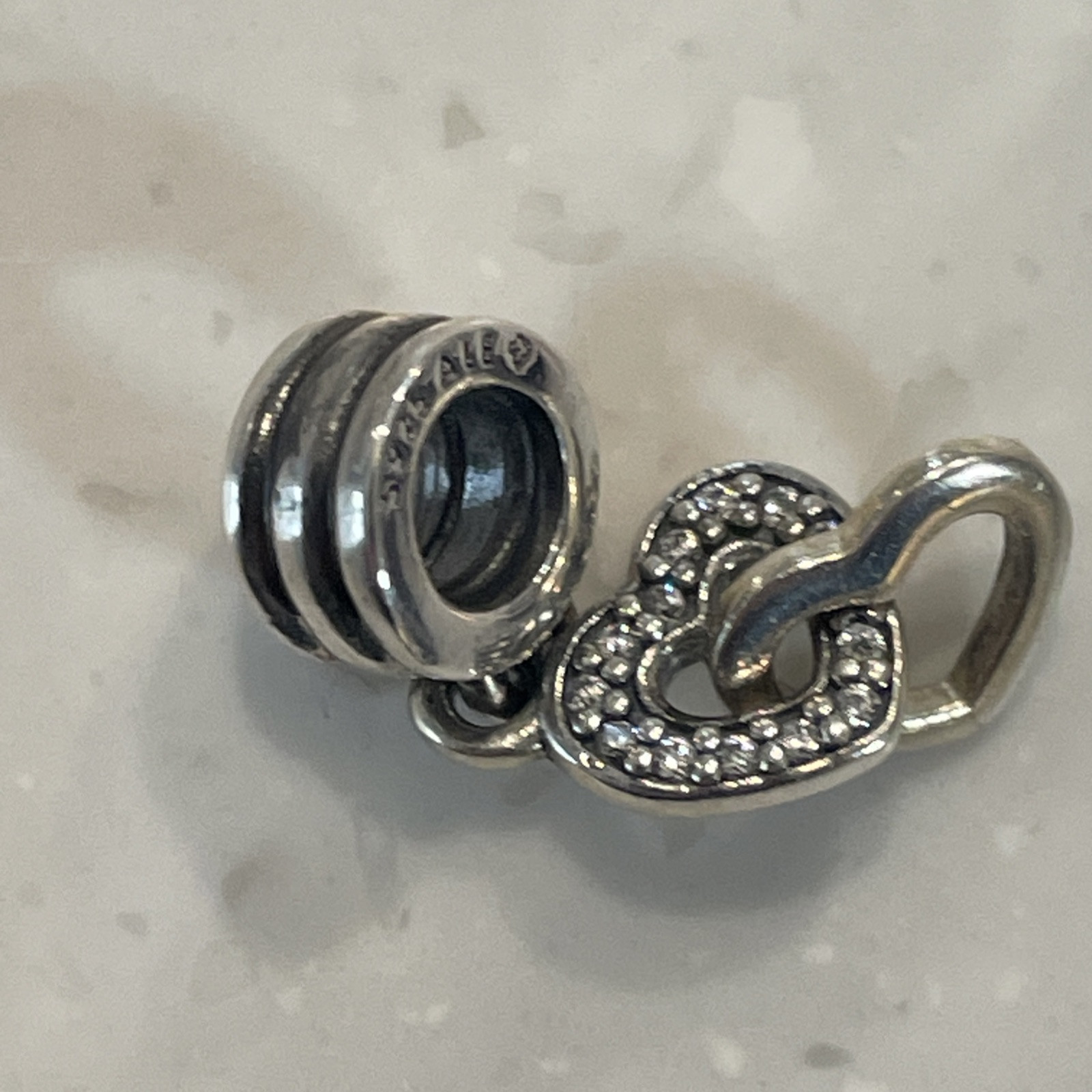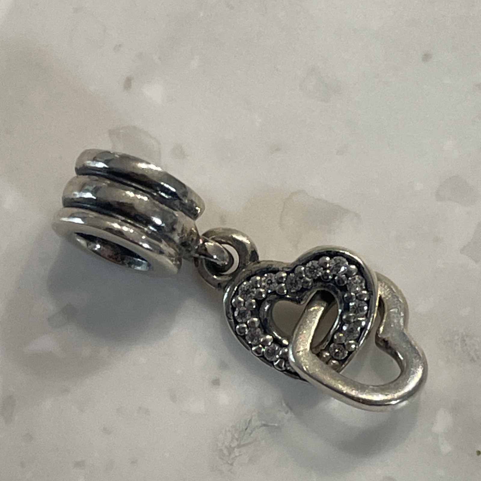 Genuine Pandora Interlocking Hearts Dangle Charm, retired, 925 ALE, CZ Features two interlocked hearts, one with embedded crystals. It can be worn on Pandora charm bracelets or as a necklace pendant. This design symbolizes an unbreakable bond or love connection. It is a retired Pandora charm and may be considered a collectible. Please look at photos, as this is the exact item that you will receive! Pictures are the best description and feel free to ask questions of items before bidding. Please note I usually sell preowned or vintage items that were cherished by a previous owner, and may have been worn and I cannot guarantee authenticity. Thus items are rarely in "mint/perfect" condition. Each item is closely looked at before listed, and it is described as detailed as possible. Please refer to the item pictures to view more about their condition.