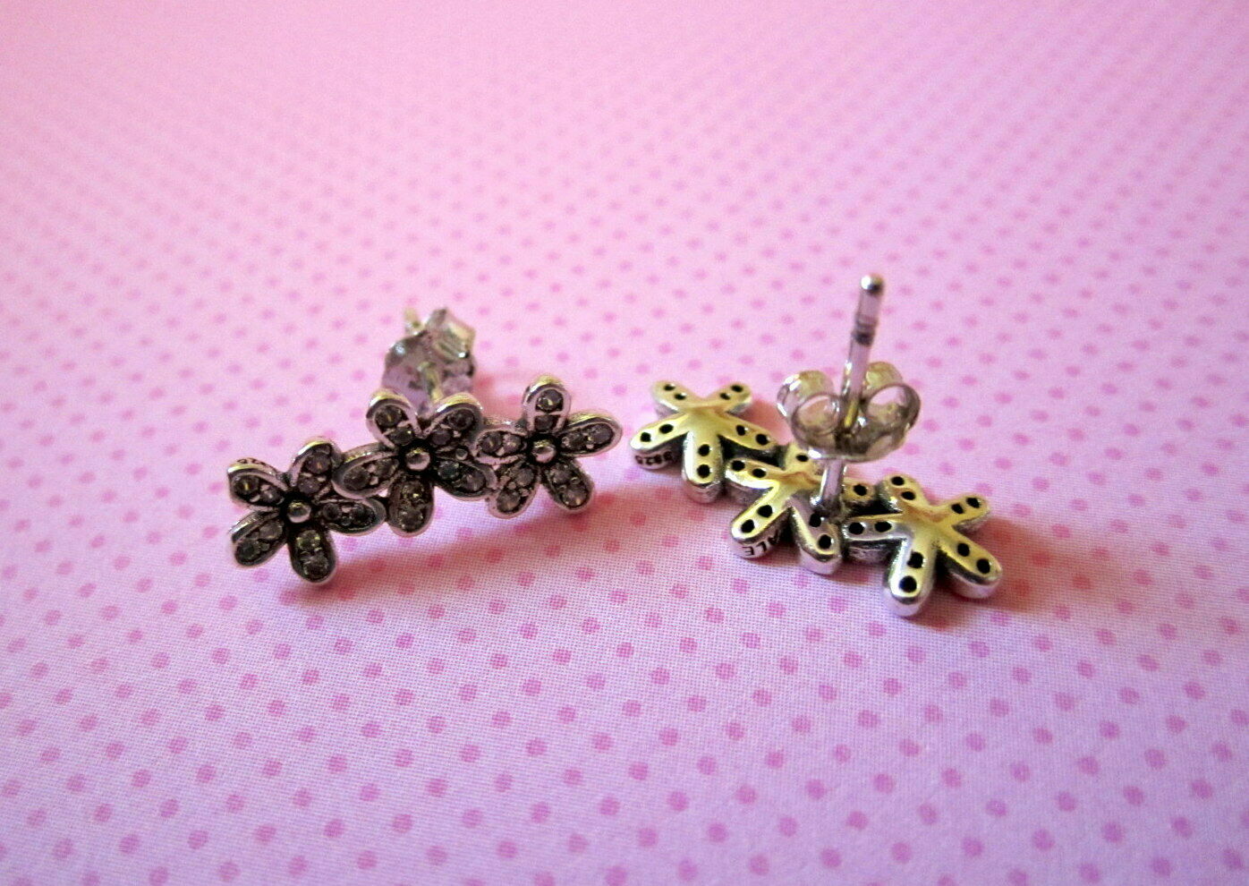 DETAILS This listing is for these beautiful Pandora dazzling daisy earrings. They feature clear crystals and are sterling silver with stamp on side and post. The measurements are approx. 17mm long by 6mm wide. These will come in a pouch. Please ask any questions that you may have! FEEDBACK POLICY DUE TO A LARGE NUMBER OF BUYERS THAT NEVER RETURN FEEDBACK...I WILL ONLY GIVE IT AFTER THE BUYER DOES. WHEN THE BUYER RECEIVES THEIR ITEM AND LEAVES ME POSITIVE FEEDBACK, I PROMISE TO RETURN THE FEEDBACK TO THEM. SOMETIMES IT TAKES ME A FEW DAYS BUT I WILL GET IT TO YOU!! IF THE BUYER IS NOT HAPPY WITH SOMETHING I ASK THEM TO PLEASE CONTACT ME BEFORE LEAVING FEEDBACK AND GIVE ME THE FAIR CHANCE TO MAKE THINGS RIGHT!! I HOPE THAT MY BUYERS WILL UNDERSTAND AND I THANK YOU!! QUESTIONS Ask any question that you may have. If you are not happy with this item when you receive it.... please contact us instead of leaving a negative feedback. We are always willing to work anything out. Our customers come first and we want them to be happy. We always promise excellent customer service. A happy customer comes back!! We stand 100% behind our products and 100% guarantee all of them!! PAYMENT DETAILS USA and OUTSIDE USA: We accept PAYPAL payments. We do combine shipping on multiple items IF all items are paid within one payment. PLEASE WAIT FOR COMBINED SHIPPING INVOICE!! If you cannot pay with Paypal immediate, please let us know right away. This will keep us from bothering you with tons of invoices because we will know when to expect your payment!! Items MUST be paid for within 4 days. If not, We will relist the item and file a Non-Paying Bidder complaint. We truly hope that all transactions can be smooth and pleasant!! PLEASE understand that shipping is more than just stamps or postage. We do combine shipping on multiple items IF all items are paid within one payment. PLEASE WAIT FOR COMBINED SHIPPING INVOICE!! I try and ship items out within 24-48 hours after payment is received. I am very careful to package items extremely well which requires alot of high quality packing materials. Please also understand that no matter how fast I ship...the postal service is out of our control. Thank you! FOR RETURNS If you feel that you are not happy with an item, please CONTACT ME before leaving feedback. If the item is broken...I require return and will refund your payment in full when the item gets back to me. If you just dont want the item and choose a REFUND please understand that I cannot issue it until I have the item back in my home and it is in the EXACT shape as when it left. You will need to return the item at your own expense and refunds do not include shipping unless the item is broken or not as described. This is the only way that I can recover some of my costs that I would otherwise lose. THANK YOU!!