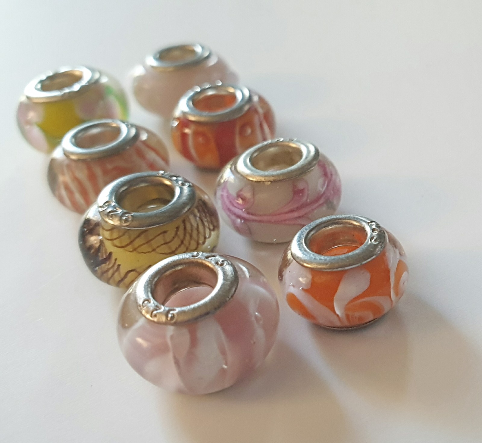 This lot of 8 Pandora and Murano like glass bead charms are marked as 925 sterling silver. Each charm is round in shape and features a multicolor design, perfect for any occasion. These beautiful beads are made of glass and have a beaded style, adding a touch of beauty to any charm bracelet or necklace. With no secondary or main stones, these charms offer a versatile and elegant look with a touch of silver purity. Ideal for those looking to customize and enhance their jewelry collection with a high-quality and unique charm. I strung them on a small chain for display only.
