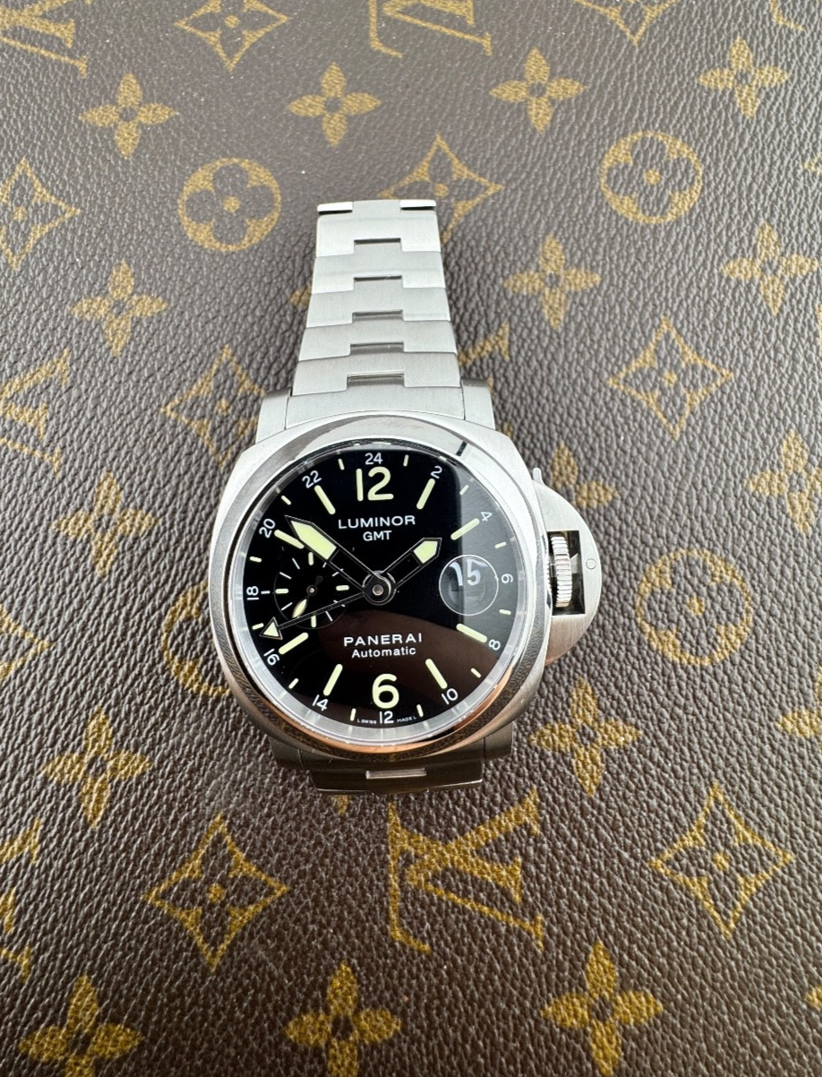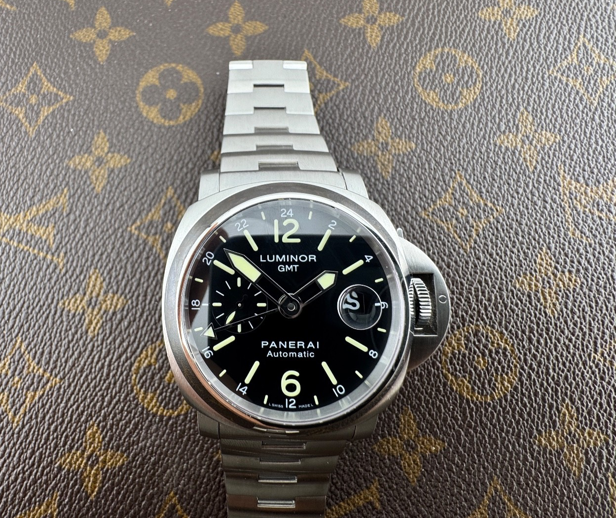 PROPONIAMO; -Marca: PANERAI GMT (PAM00297) -Cassa: ACCIAIO DA 44MM , FONDELLO A VITE ORIGINALE -Movimento :PANERAI OP VIII , AUTOMATICO COEVO -Vetro:ZAFFIRO ORIGINALE -Corona:ORIGINALE CON BLOCCA CORONA -Ghiera: LISCIA -Tasti: NO -Quadrante:NERO ORGINALE , LUMINOVA -Lancette: ORIGINALI LUMINOVA -Cinturino/Bracciale: ACCIAIO DA 24MM , DOPPIA CHIUSURA DEPLOYANTE ADATTO A POLSI FINO A 21/22CM -Scatola e documenti: NOSTRA POCHETTE IN VELLUTO COMPRESA -Condizioni : OTTIME -Revisionato:SI -Uomo/donna/unisex:UOMO PER QUALSIASI DUBBIO CONTATTATEMI ,RISPONDEREMO IL PRIMA POSSIBILE