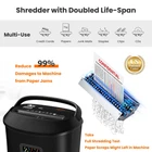 58 dB Quiet Working with 10 Minutes Shredding: 58 dB low noise creates the quiet and comfortable atmosphere. Also, this paper shredder features extra fast shredding speed with 10 minutes running time and 60 minutes cooling cycle. Also equipped with overheat LED indicator P-3 High Security level: This crosscut paper shredder takes max 14-sheet of 20-pound bond paper down to 0.19 inches by 1.5 inches (5 by 38 mm) at a time, no need to remove staples or clips. Also shreds credit card, CD, junk mail (one at a time) Longer Life Span: The US patented cutter can prevent 99% damages to shredder from paper jams and prolong its life span. SEVERAL small paper particles might be left in the basket or cutter due to full quality test by manufacturer Convenient Design: The shredder has 3-mode control switches (Auto, Off, Rev); Auto start, stop and manual rev functions simplify shredding and paper jam clearing processes, release you from the frustration of jamming. It has 1-Year protection Easy Emptying: This heavy duty paper shredder comes with 6.6 gallons bin and portable handle that offer less frequent and easy emptying. Transparent window helps to see when it is full. Also, THIS SHREDDER DO NOT NEED LUBRICANTS Reliable Customer Service Support: If you have any usage questions, please follow the troubleshooting steps in the user manual (included in the package)